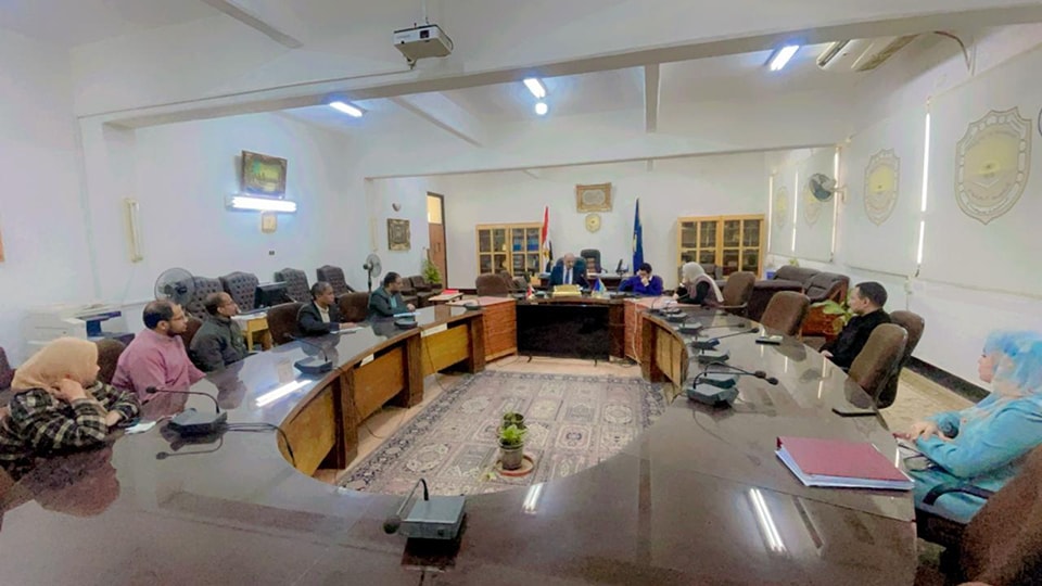 اجتماع اليوم الخميس الموافق ٢٠٢٤/١١/٢٨ م سعادة الأستاذ الدكتور حازم المشنب عميد الكلية وبحضور الاستاذ الدكتور مصطفى رضوان مدير وحدة الجوده ورئيس قسم الجيولوجيا مع أ.م.د./ مصطفى عبد الله رئيس لجنة القياس وتقييم الأداء بالكلية و أعضاء اللجنة.