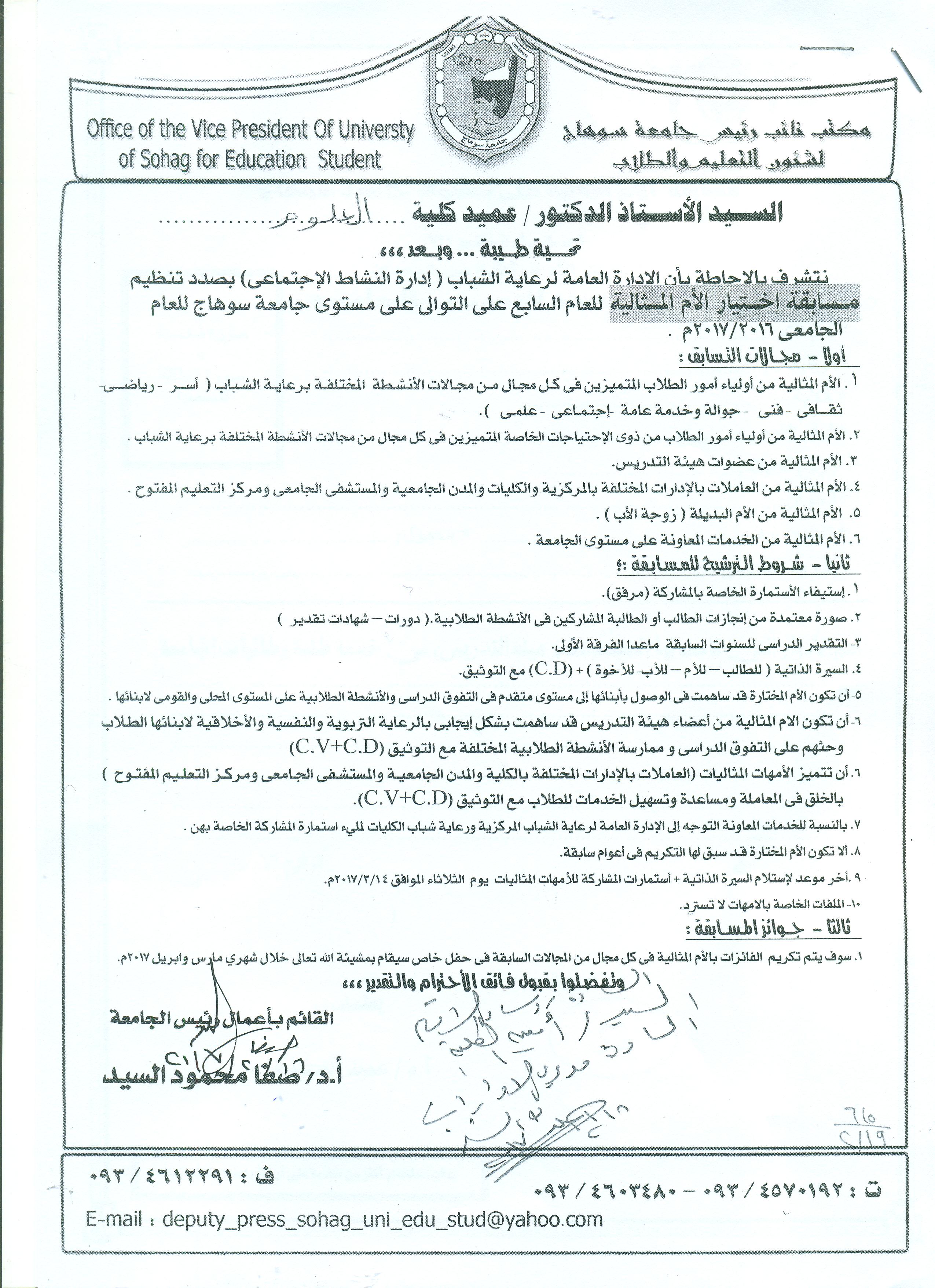 نشر على 21 فبراير, 2017نشر في اخبار الكلية تنظيم مسابقة إختيار الأم المثالية تصفّح المقالات عقد ندوة تعريفية لطلاب الجامعة بشكل عام وعلى وجه الخصوص طلاب كلية العلومتعيين سهام عليو عامر فى وظيفة مدرس بقسم الرياضيات