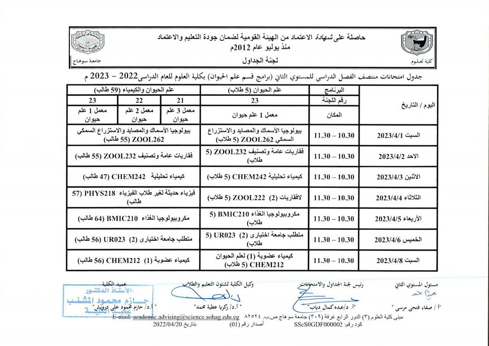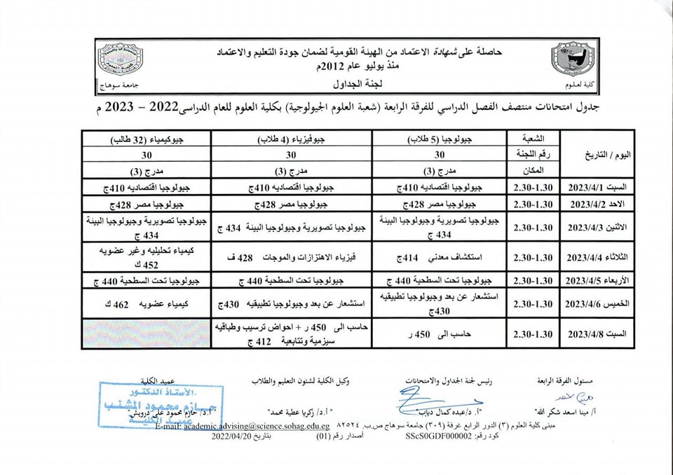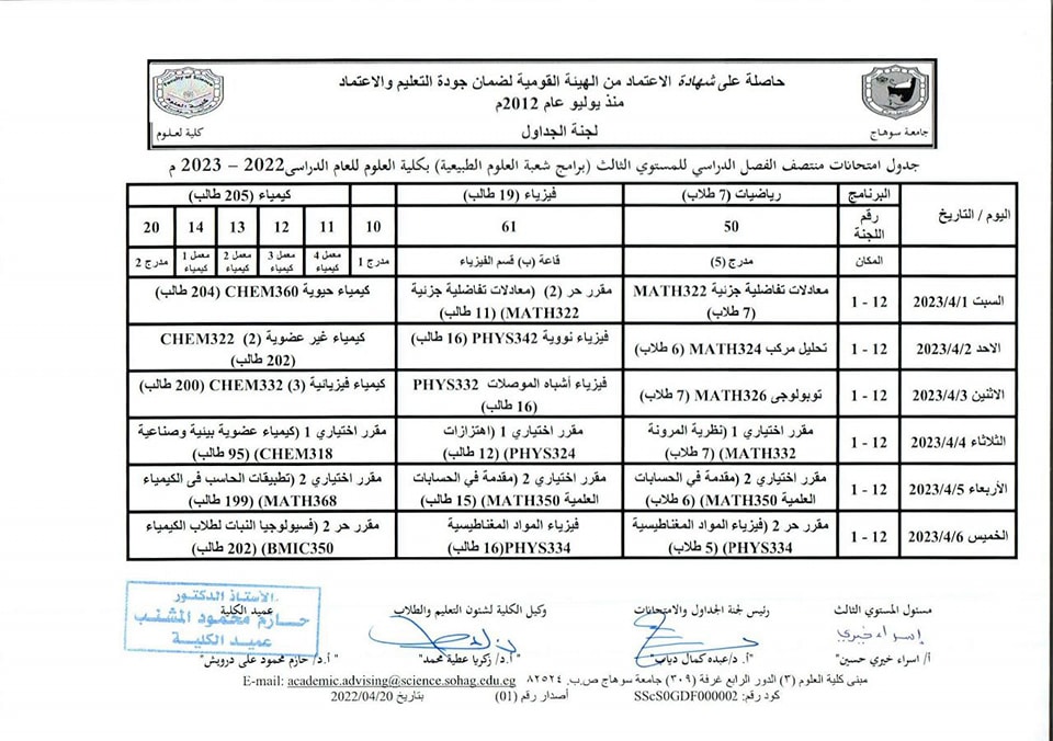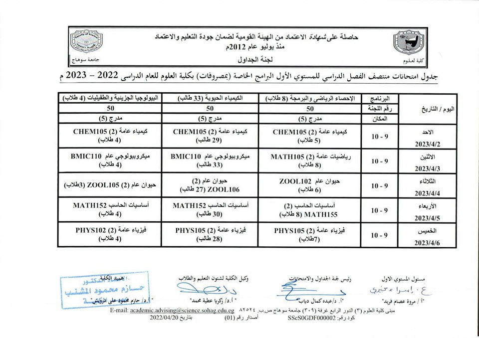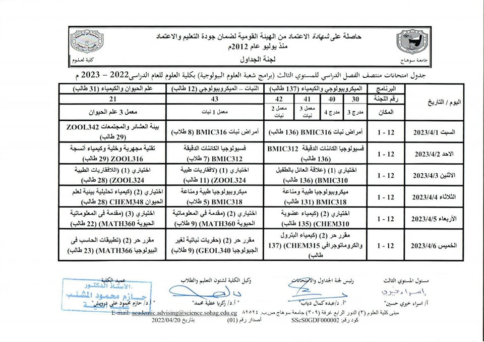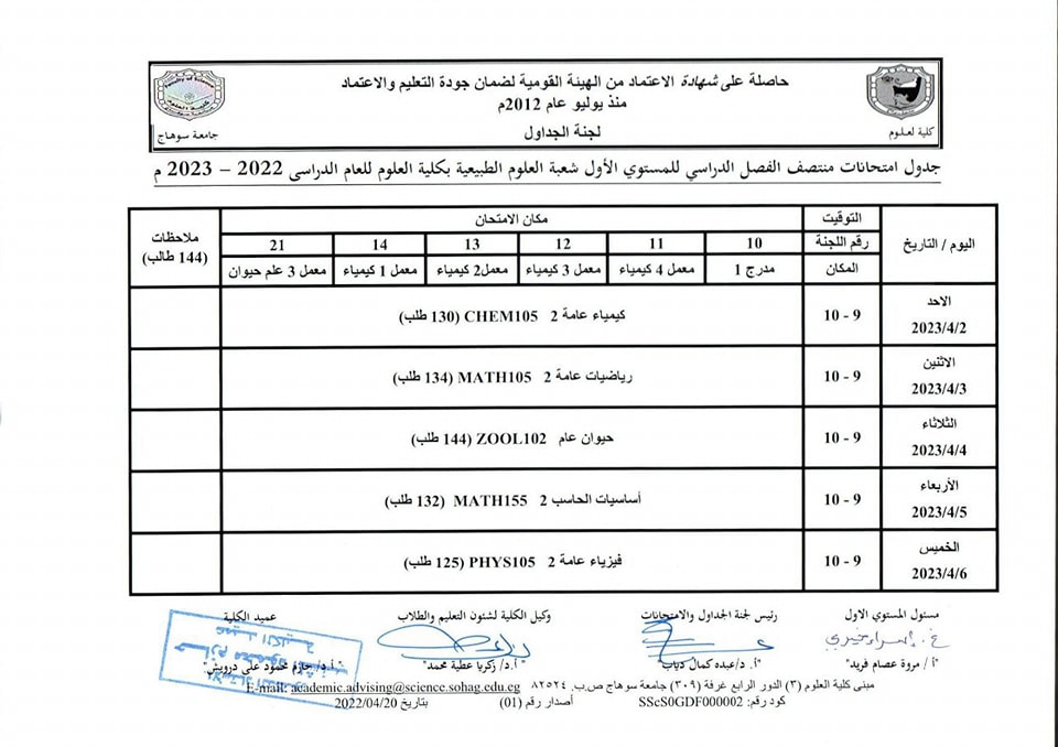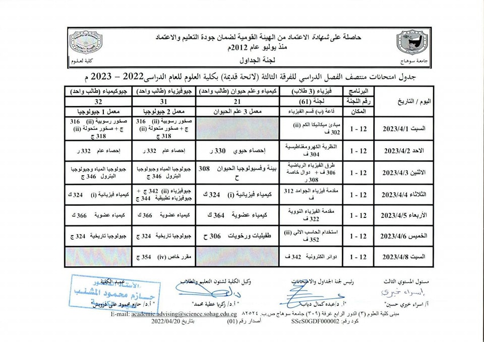 نشر على 26 مارس, 2023نشر في احداث وفعاليات،اخبار الكلية،المقررات الدراسية،جداول الامتحانات،شئون الطلاب جداول الميدتيرم لطلاب كلية العلوم تصفّح المقالات كلية العلوم تستعد لاعتماد عدد من معاملها البحثية.زيارة متحف سوهاج القومى