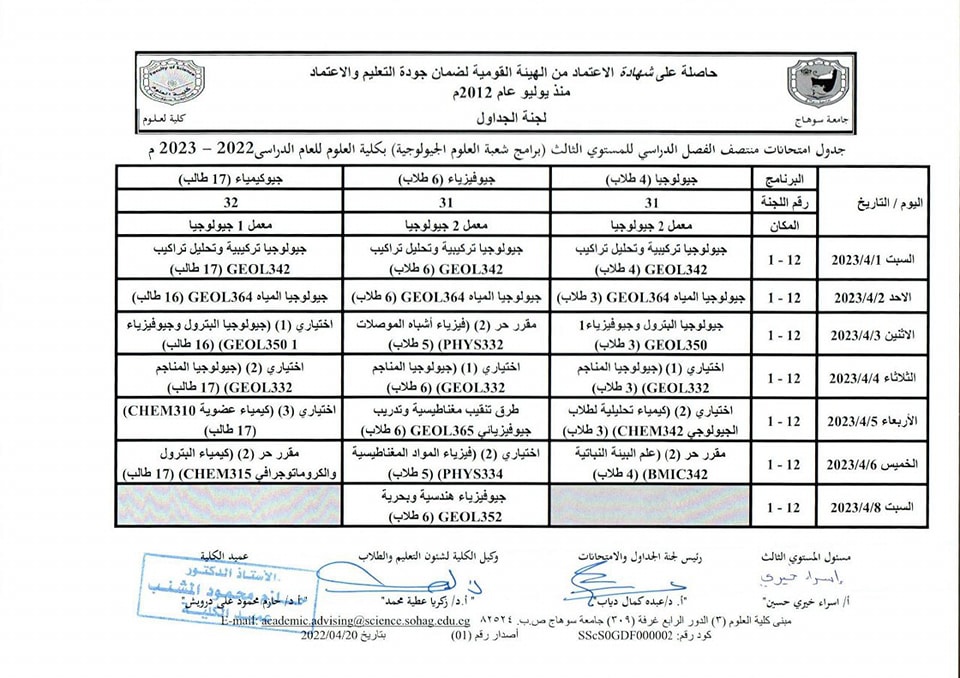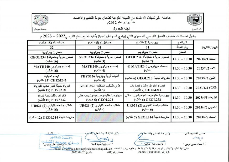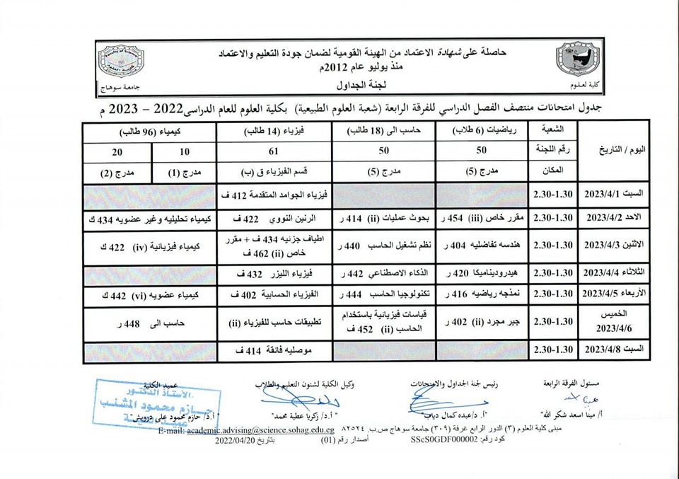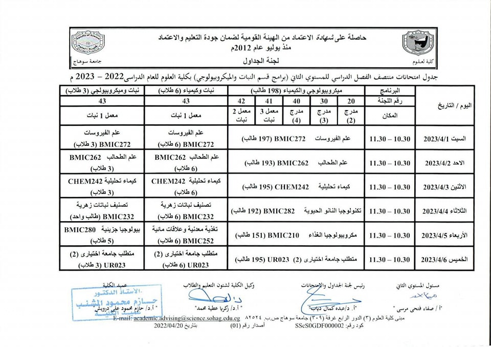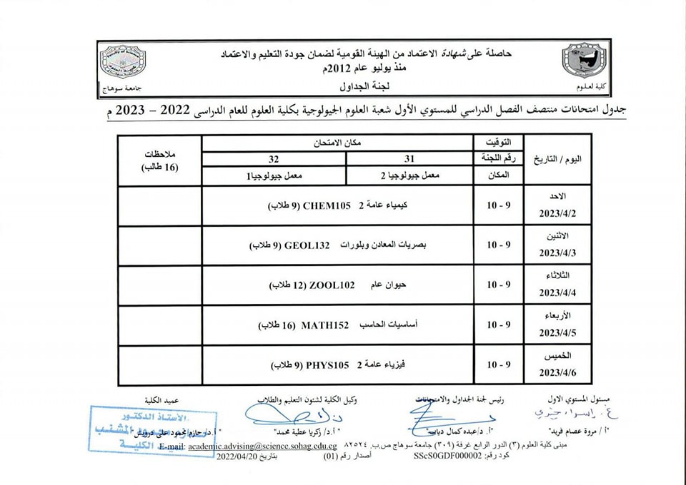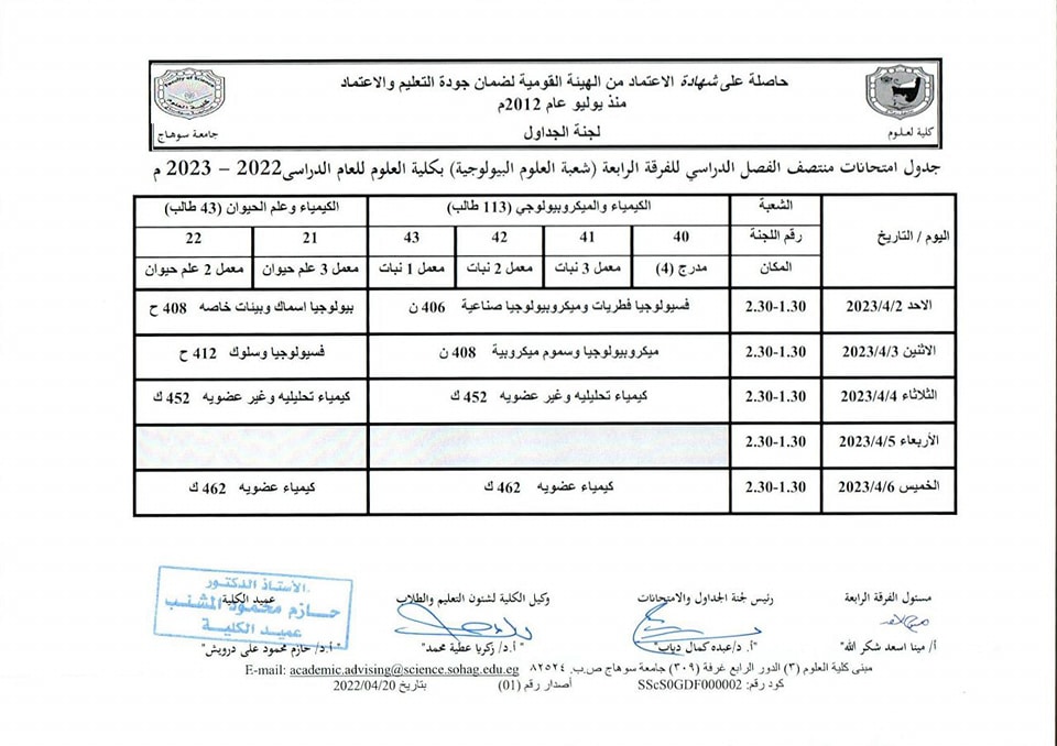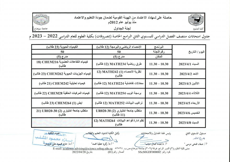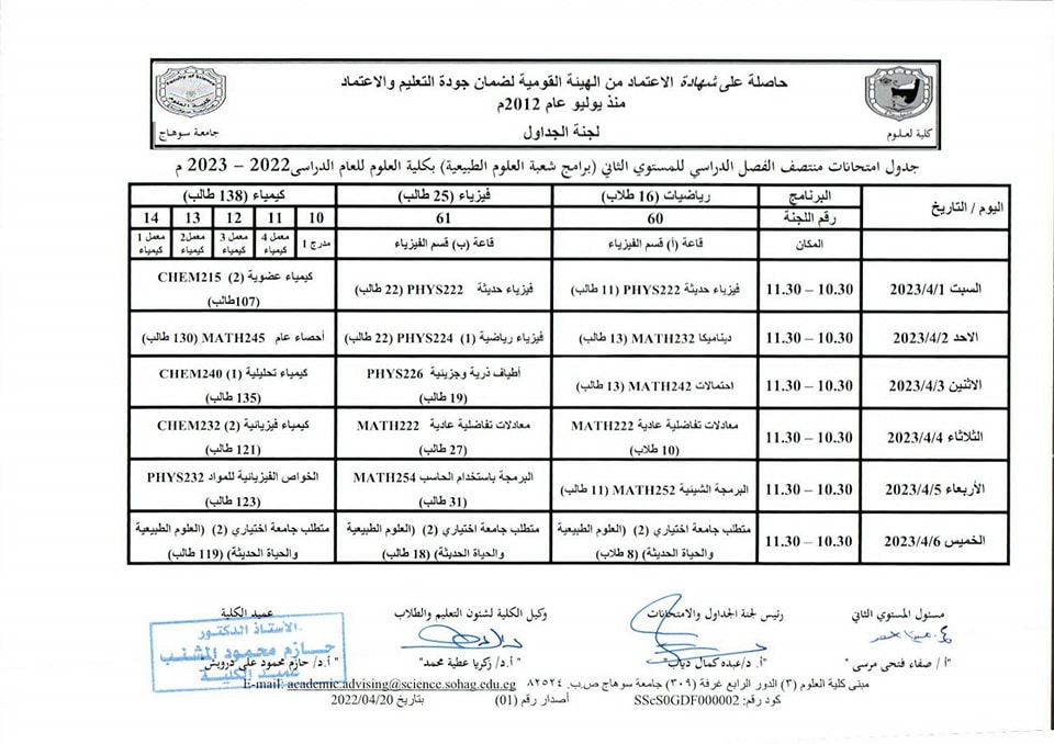 نشر على 26 مارس, 2023نشر في احداث وفعاليات،اخبار الكلية،المقررات الدراسية،جداول الامتحانات،شئون الطلاب جداول الميدتيرم لطلاب كلية العلوم تصفّح المقالات كلية العلوم تستعد لاعتماد عدد من معاملها البحثية.زيارة متحف سوهاج القومى