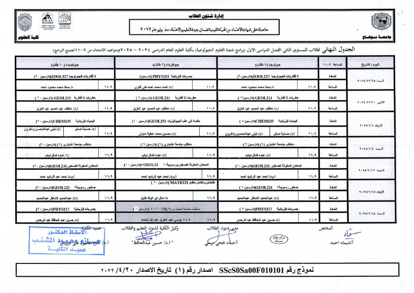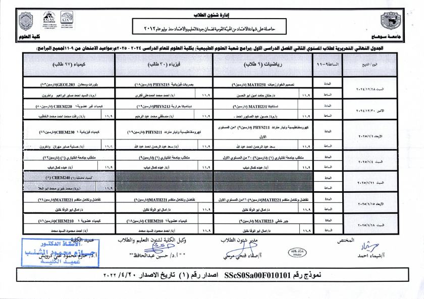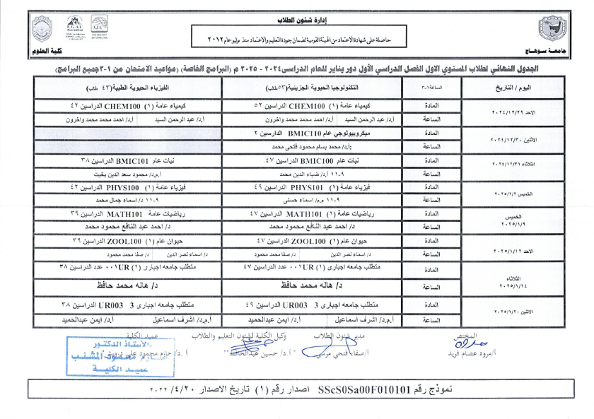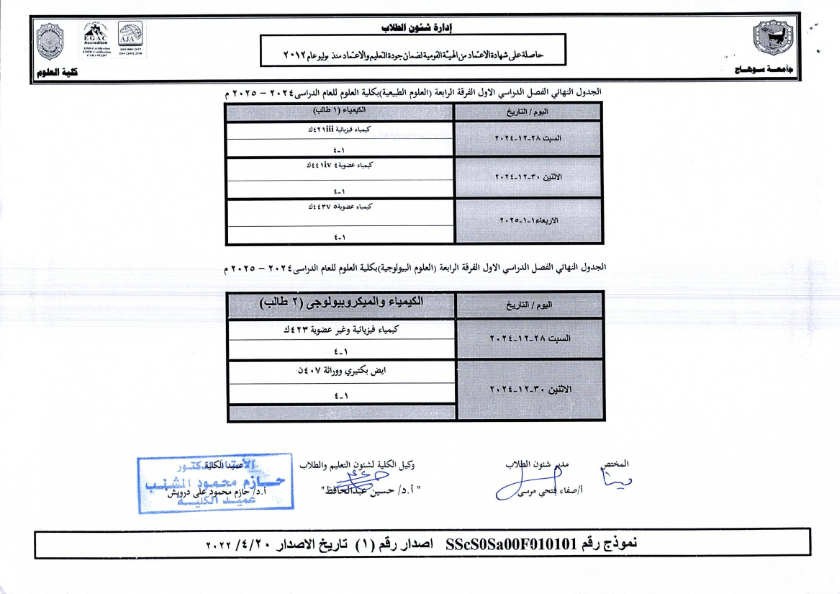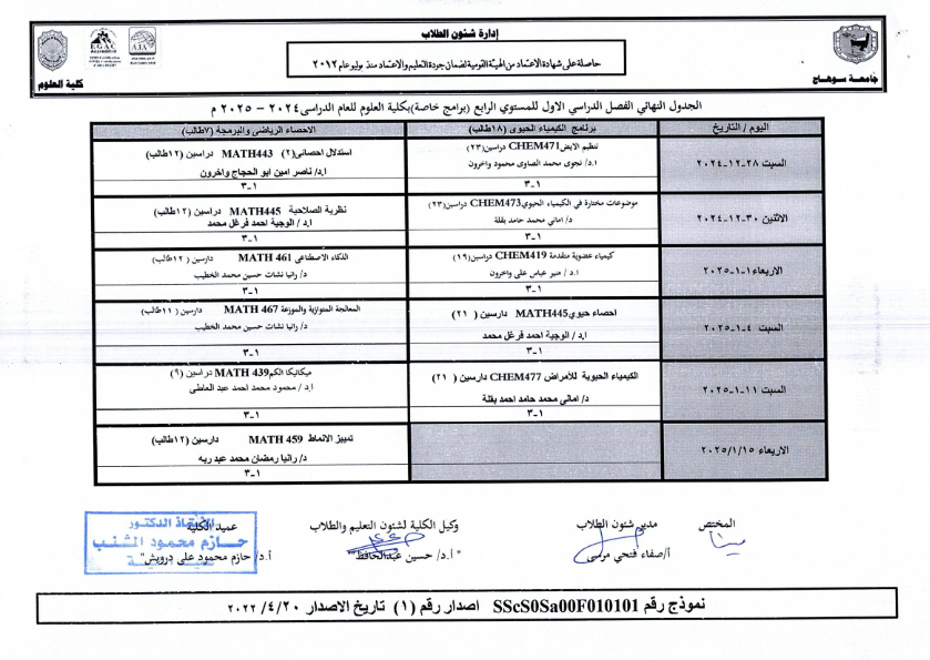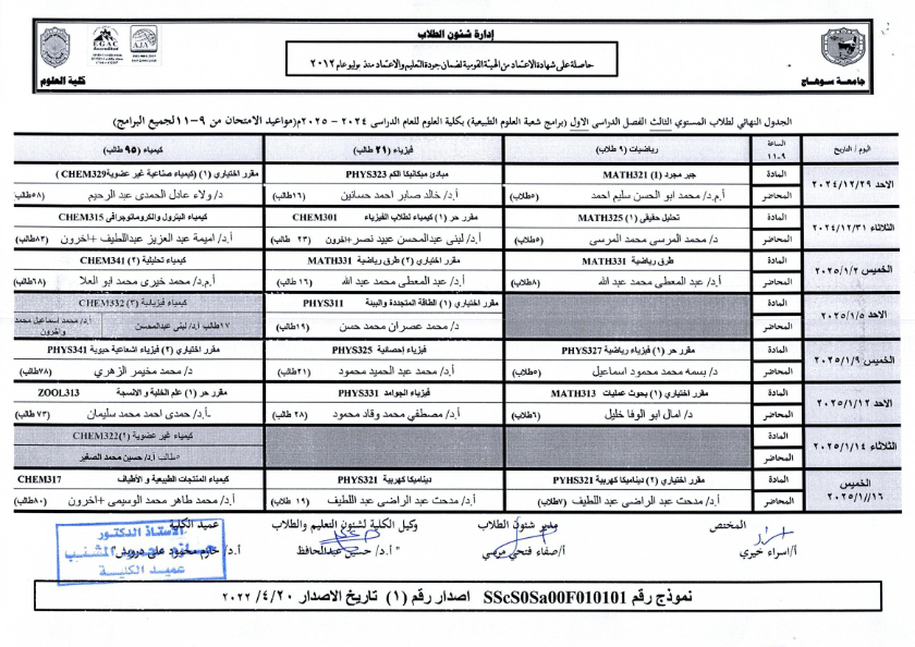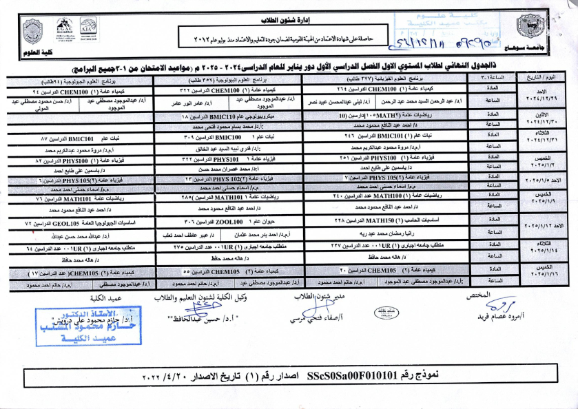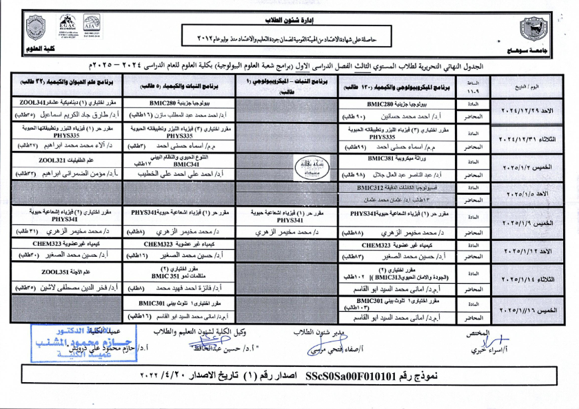 نشر على 18 ديسمبر, 2024نشر في احداث وفعاليات،اخبار الكلية جداول امتحانات كلية العلوم ٢٠٢٤ – ٢٠٢٥ جداول امتحانات كلية العلوم ٢٠٢٤ – ٢٠٢٥ تصفّح المقالات بيان بأماكن لجان الامتحانات للفصل الدراسي الأول 2025_2024مكتبة القسم