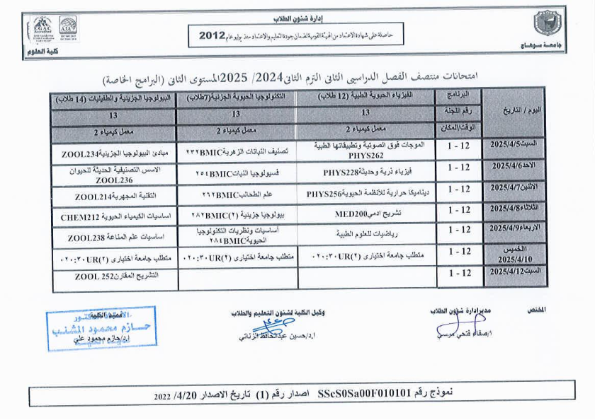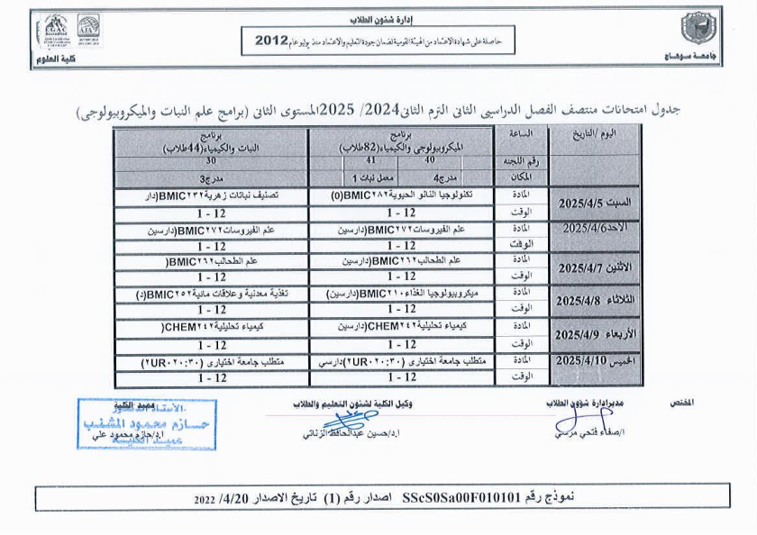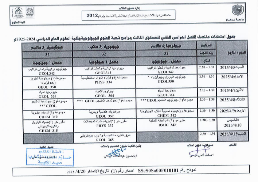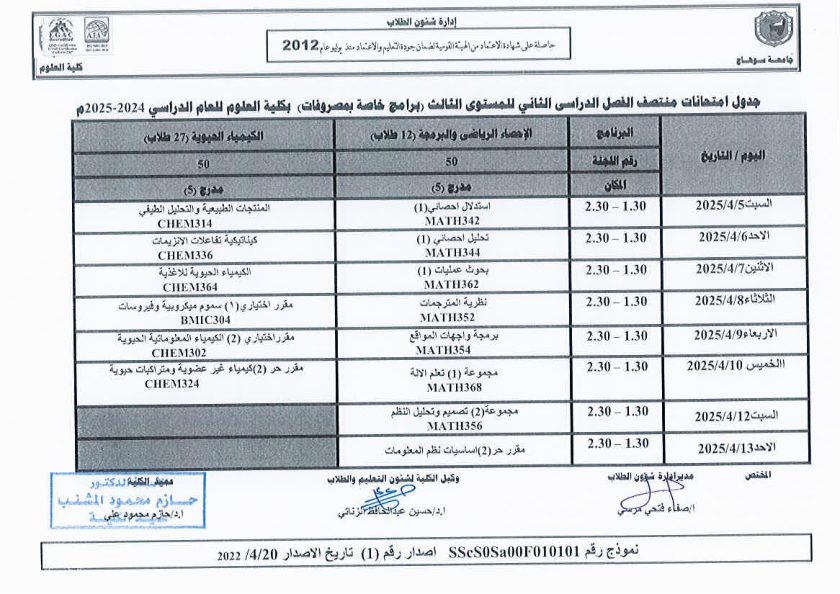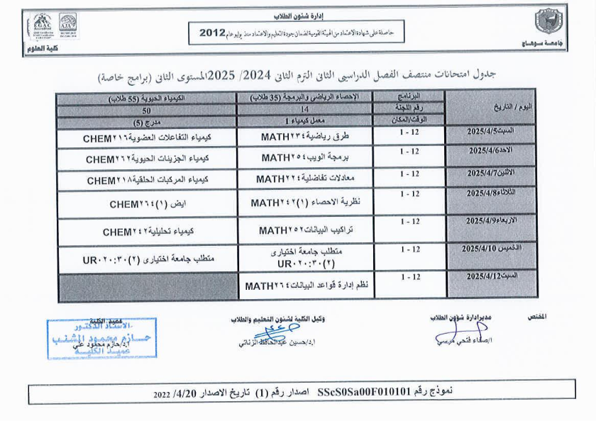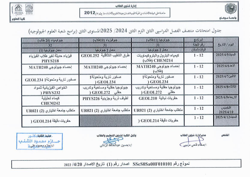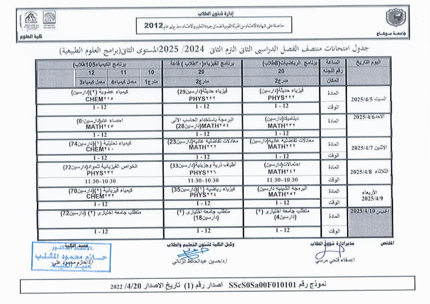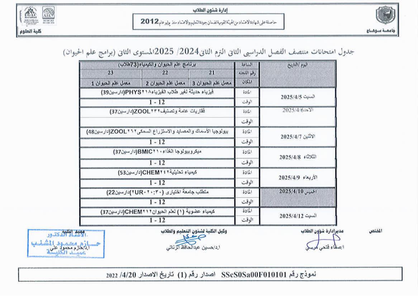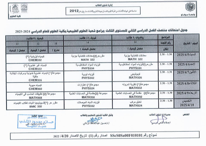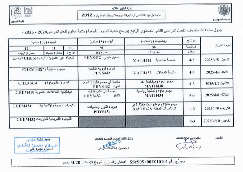 نشر على 6 أبريل, 2025نشر في احداث وفعاليات،اخبار الكلية جدول امتحانات منتصف الفصل الدراسي الثاني 2024-2025 تصفّح المقالات مناقشة رسالة الماجستير للطالبة/ يثرب احمد خليفة – معيدة بقسم الكيمياءتكريم الطلاب الفائزين في المسابقة الدينية بالعشر الأواخر من رمضان