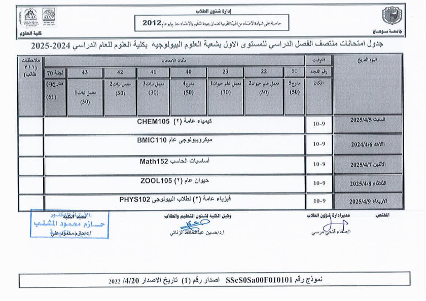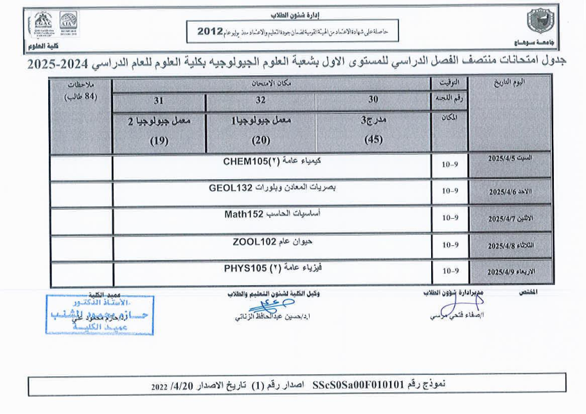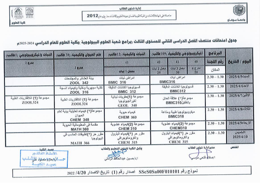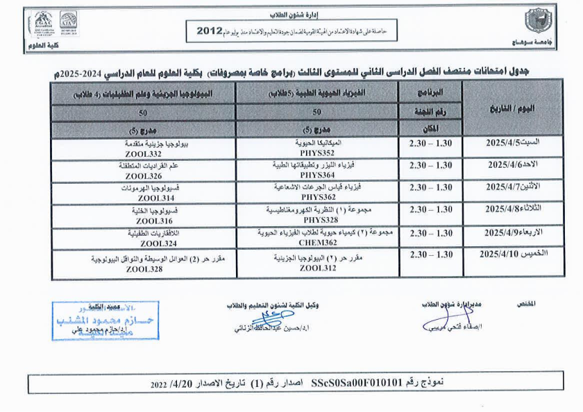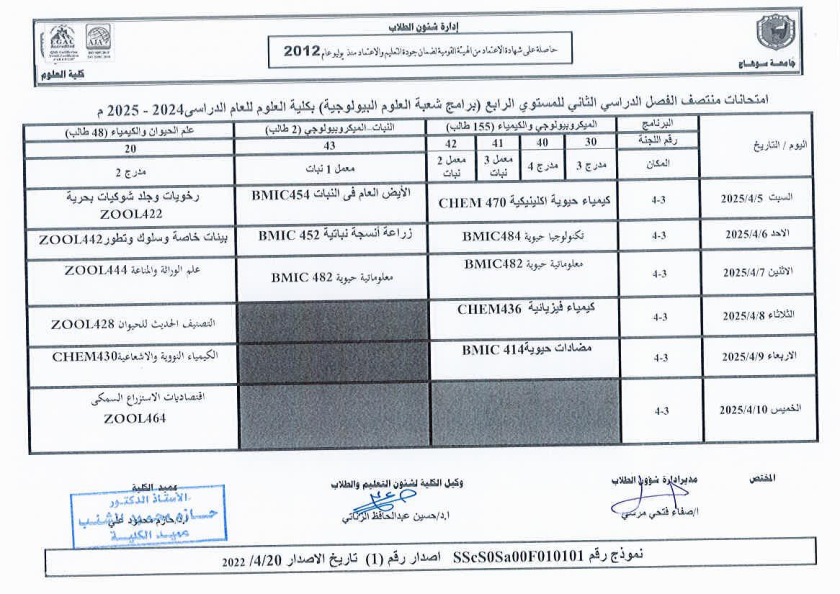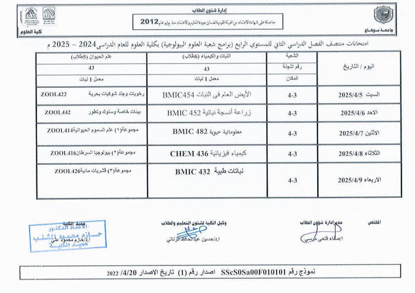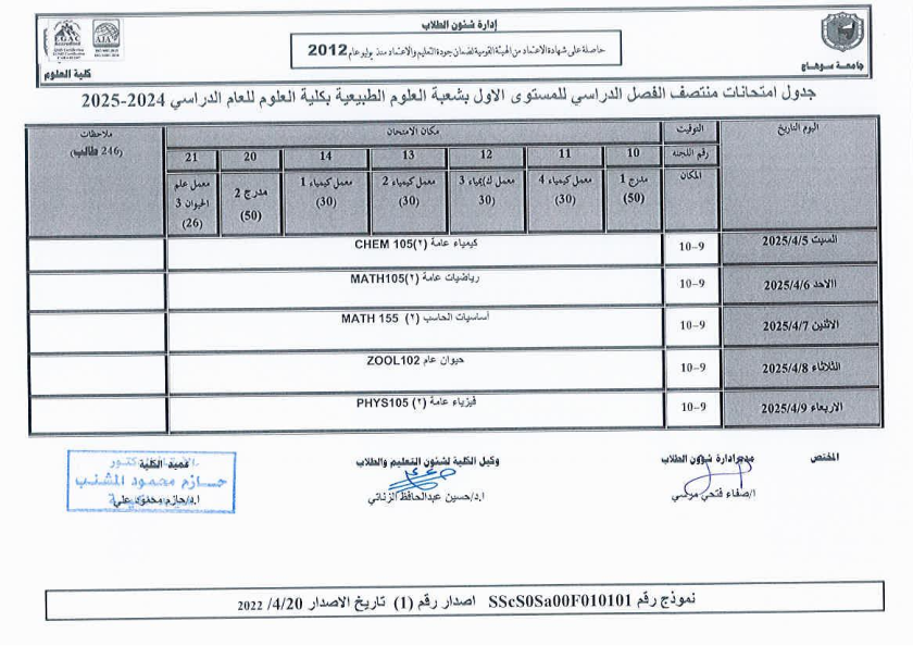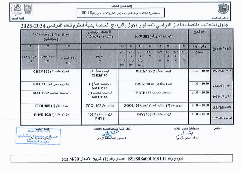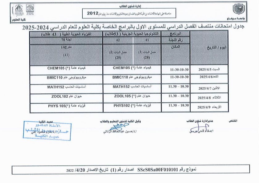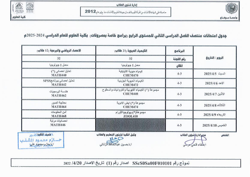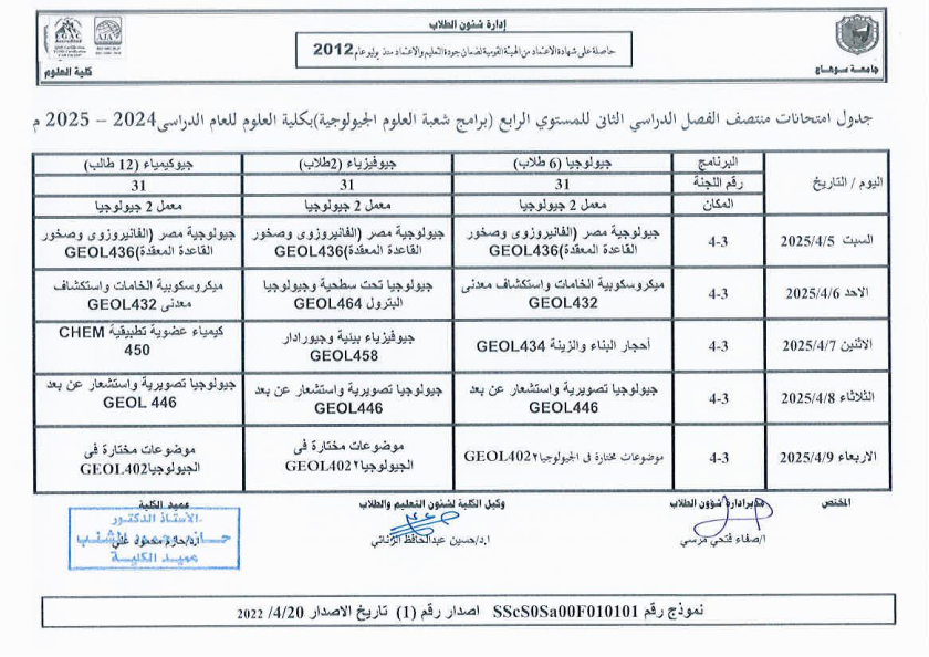 نشر على 6 أبريل, 2025نشر في احداث وفعاليات،اخبار الكلية جدول امتحانات منتصف الفصل الدراسي الثاني 2024-2025 تصفّح المقالات مناقشة رسالة الماجستير للطالبة/ يثرب احمد خليفة – معيدة بقسم الكيمياءتكريم الطلاب الفائزين في المسابقة الدينية بالعشر الأواخر من رمضان
