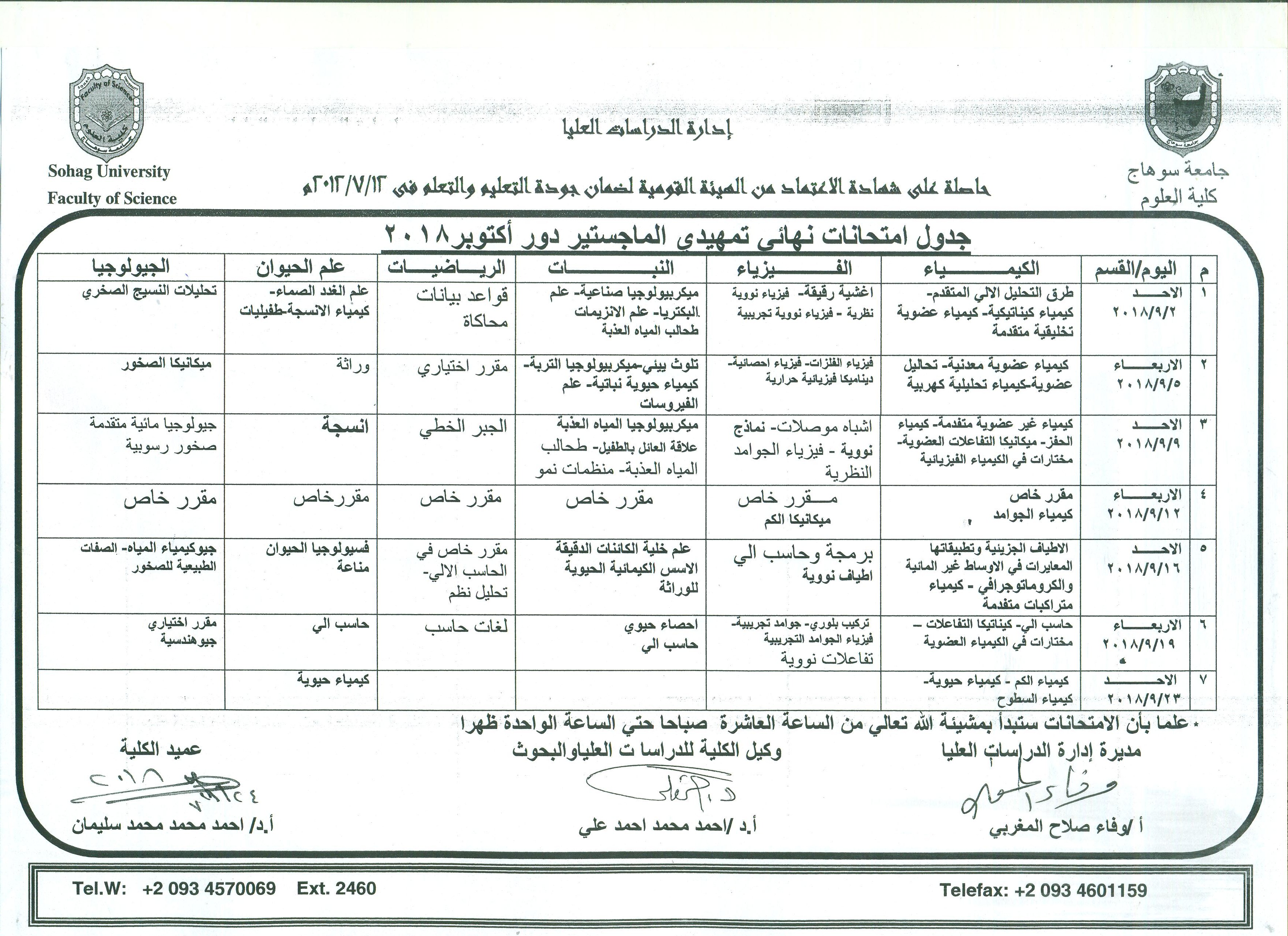 جدول امتحان نهائى تمهيدى الماجستير دور اكتوبر 2018
