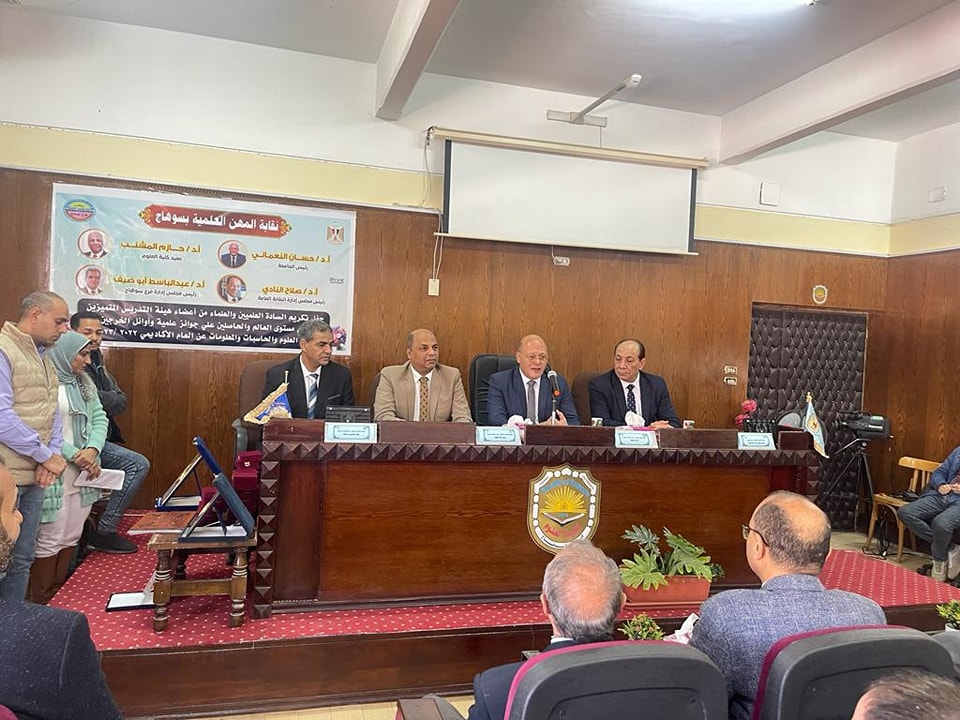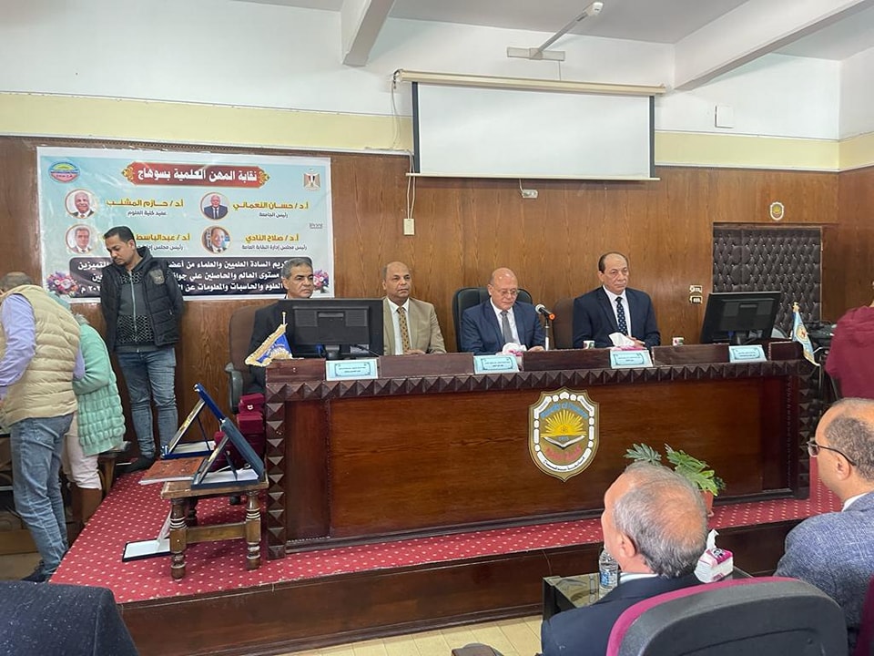 تحت رعاية معالى الوزير ا.د حسان النعمانى رئيس جامعة سوهاج والاستاذ الدكتور حازم المشنب عميد كلية العلوم والاستاذ الدكتور صلاح النادى نقيب العلميين بالنقابة العامة بالقاهرة والاستاذ الدكتور عبدالباسط محمد أبوضيف نقيب العلميين بسوهاج، وبحضور سعادة وكلاء كلية العلوم ولفيف من أعضاء هيئة التدريس ومعاونيهم، نظمت نقابة المهن العلمية بسوهاج حفل تكريم للسادة العلميين المتميزين من أبناء كلية العلوم والذين تم ادراج أسماءهم ضمن نسبة ٢٪ لأكثر العلماء استشهاد بابحاثهم على مستوى العالم والتابع لتصنيف جامعة ستانفورد الأمريكية حيث بلغ عددهم ١٨ استاذ من كلية العلوم كما شمل التكريم السادة العلماء الحاصلين على حوائز الدولة و جوائز الجامعة وبلغ عددهم ٣ أساتذة وكذلك اوائل الخريجين على مستوى البرامج العلمية بكليات العلوم والحاسب الالى وبلغ عددهم ١٢ خريجة من اوائل الدفعات. فى بداية حديثه رحب رئيس الجامعه بالساده الحضور وأبدى اعتزازه بالاداره الحكيمه والمتميزه لكلية العلوم وأشاد بالتحول الرقمي الذي انتهجته الكلية، معرباً عن اعجابة بالتطور الملحوظ بكلية العلوم في كافة المجالات. وأشار سعادته ان هذ التكريم يأتي فى إطار التقدير لقيمة العلم والعلماء لإسهاماتهم فى خدمة الوطن وقضايا المجتمع، متمنيا لهم مزيد من التوفيق والسداد. واضاف ان ظهور عدد مميز من علماء كلية العلوم في هذا التقرير الدولي يعتبر إنجازا متميزاً ويعكس مدى الجهد المبذول في مجال الارتقاء بالبحث العلمي وأكد على تشجيعه ودعمه المستمر للبحث العلمى والعلماء للارتقاء بالجامعه لتصبح جامعة سوهاج مميزه على المستوى الإقليمى والدولى، وأبدى سعادة الاستاذ الدكتور حازم المشنب عن سعادته وفخره بهذا الإنجاز وأعرب عن شكره وتقديره لسعادة رئيس الجامعه ودعمه المستمر لكلية العلوم وكذلك شكره لسعادة الاستاذ الدكتور صلاح النادى رئيس مجلس إدارة نقابة العلميين والاستاذ الدكتور عبد الباسط أبوضيف رئيس فرع نقابة سوهاج وأكد سعادته على أن البحث العلمى فى كلية العلوم يأتى فى مقدمة أولوياتها وانه سعيد لحصول ١٨ عالم بكلية العلوم ضمن أفضل 2% من علماء العالم والذى يعد إنجاز غير مسبوق و أنه يتطلع للمزيد من الإنجازات على كافة المستويات وهذا وقد تم الاحتفال بقاعة الاجتماعات بكلية العلوم فى وجود مجلس إدارة النقابة بسوهاج الدكتور عبدالرازق هدهد والدكتور معتصم سليم والمهندس خليل عشرى.