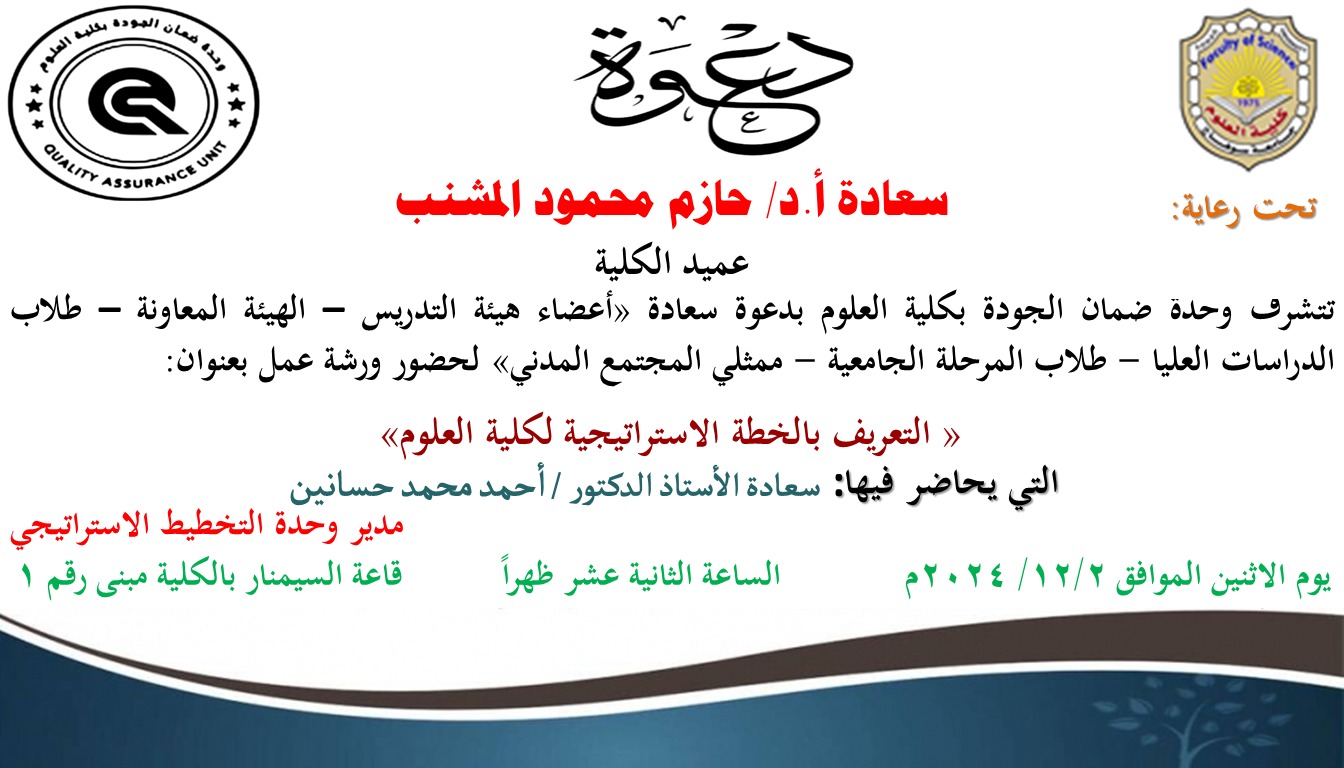 دعوة لحضور ورشة عمل بعنوان “التعريف بالخطة الاستراتيجية لكلية العلوم”