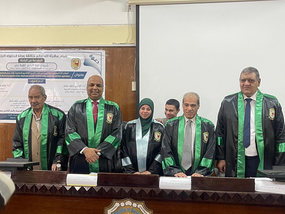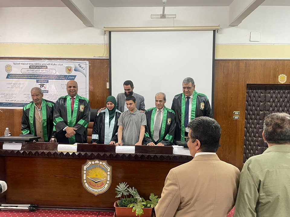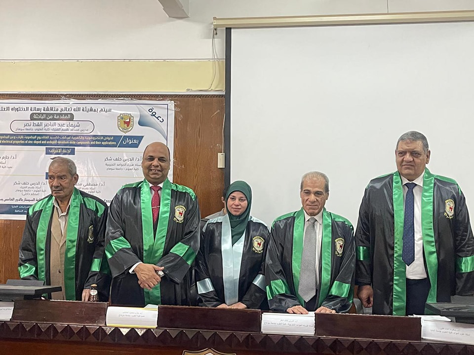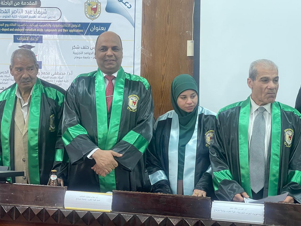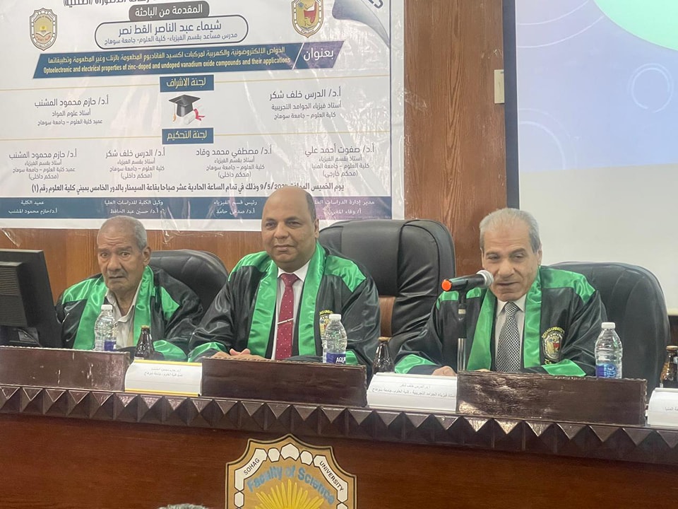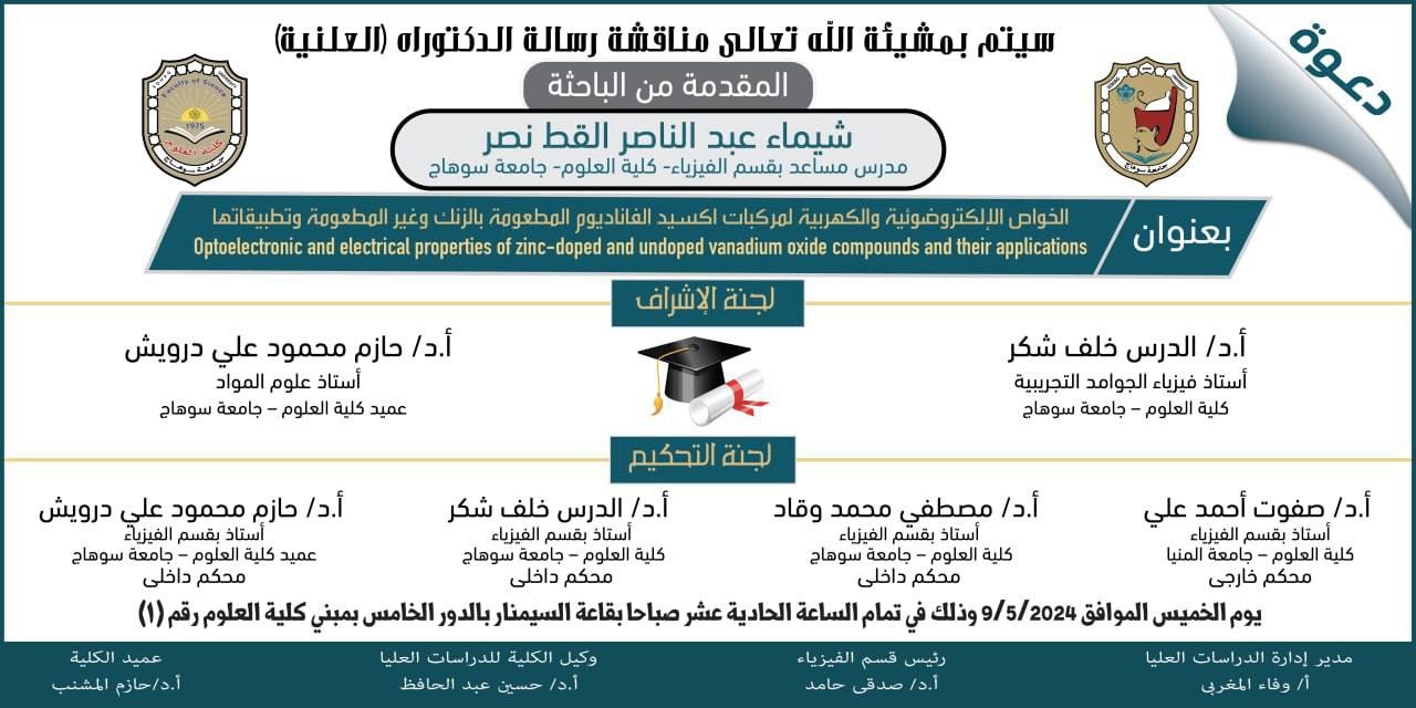 نوقشت اليوم الخميس ٩ مايو ٢٠٢٤م بقاعة السيمنار بكلية العلوم رسالة الدكتوراه للباحثه شيماء عبد الناصر القط المدرس المساعد بكلية العلوم تحت عنوانٕ** الخواص الالكتروضوئية والكهربية لمركبات اكسيد الفناديوم المطعومه بالزنك وغير المطعومه وتطبيقاتها**