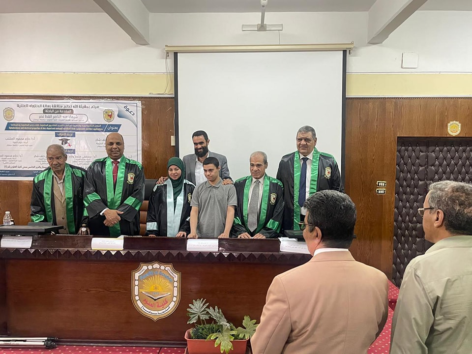 وتكونت لجنة الحكم والمناقشة من الاستاذ الدكتور صفوت احمد على -جامعة المنيا والاستاذ الدكتور مصطفى محمد وقاد الاستاذ بقسم الفيزياء والاستاذ الدكتور الدرس خلف الاستاذ بقسم الفيزياء ونائب رئيس الجامعه السابق والاستاذ الدكتور حازم المشنب عميد كلية العلوم