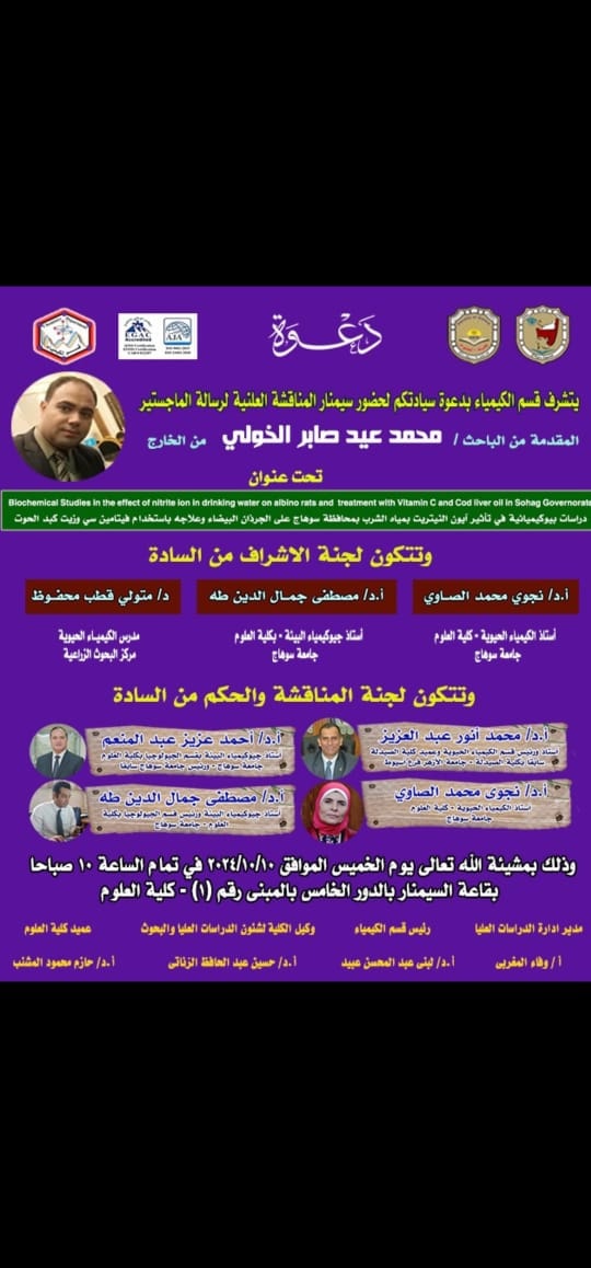 نوقشت الخميس الموافق 10/10/2024 رسالة ماجستير للباحث محمد عيد تحت عنوان *دراسة بيوكيميائية فى تأثير ايون النيتريت بمياه الشرب بمحافظة سوهاج على الجرزان البيضاء وعلاجه باستخدام فيتامين C وزيت كبد الحوت**. وتكونت لجنة الحكم والمناقشة من المحكمين