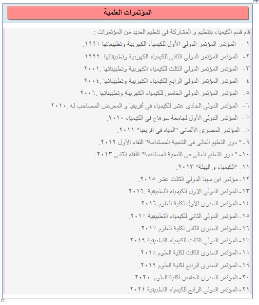 تم نشر اكثر من 2000 بحث من قسم الكيمياء كلية العلوم جامعة سوهاج في مختلف فروع الكيمياء مثل الكيمياء الفيزيائيه والغير عضويه والتحليليه والحيويه بالاضافه الي كيمياء المواد.