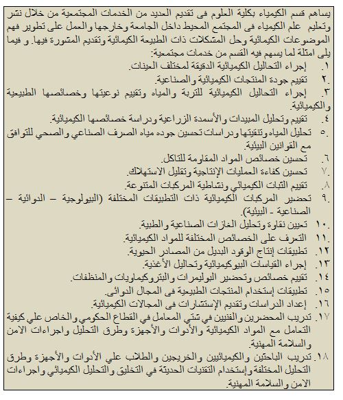 بالاضافة الى دور القسم فى العملية التعليمية و البحثية فان القسم يسهم فى تقديم خدمات مجتمعية متعددة من خلال نشر وتعليم علم الكيمياء فى المجتمع المحيط داخل الجامعة وخارجها والعمل على تطوير فهم الموضوعات الكيمائية وحل المشكلات ذات الطبيعة الكيمائية وتقديم المشورة و الاستشارات العلمية.