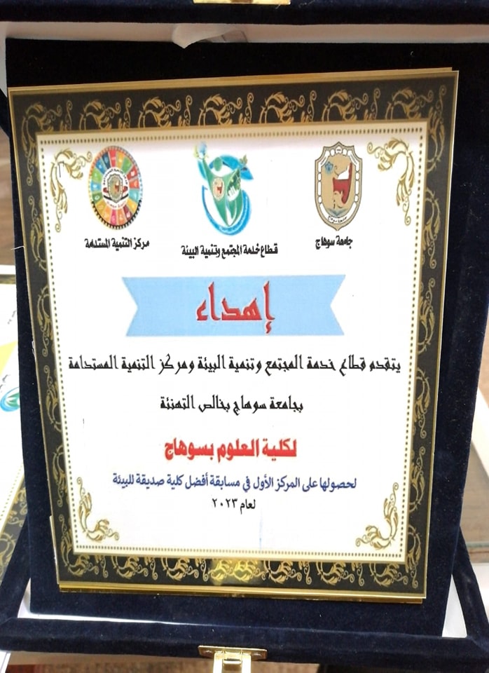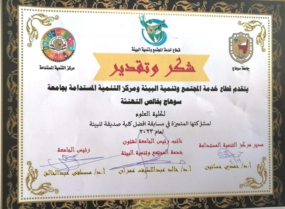 كلية العلوم أفضل كلية صديقة للبيئة بجامعة سوهاج … حصدت كلية العلوم افضل كلية صديقة للبيئة على مستوى جامعة سوهاج …. وقد قام ا. د. مصطفى عبدالخالق رئيس الجامعة و ا. د. خالد عمران نائب رئيس الجامعة لشئون خدمة المجتمع وتنمية البيئة وسعادة ا. د. حمدي حسانين مدير وحدة الاستدامة بالجامعة بتسليم درع المسابقة للاستاذ الدكتور علاء يسرى وكيل كلية العلوم لخدمة المجتمع وتنمية البيئة كأفضل كلية صديقة للبيئة بالجامعة وذلك نيابة عن ا. د. حازم المشنب عميد الكلية. وذلك علي هامش ختام فعاليات الاسبوع البيئي بالجامعة ومن الجدير بالذكر ان هذة هي المرة الأولي التي يقوم قطاع خدمة المجتمع وتنمية البيئة بالجامعة بتنظيم هذه المسابقة وذلك حرصا منه علي نشر ثقافة الاستدامة البيئية بين كليات الجامعة.. وقد تضمنت معيار المسابقة خمس معايير هي..التعليم و البحث العلمي.. ترشيد الطاقة.. إدارة المخلفات… الشكل الجمالي والبناء الأخضر.. ندوات وورش عمل الاستدامة البيئية.. هذا وقد حصلت كلية العلوم علي اعلي تقييم بين الكليات الجامعة المتقدمة للمسابقة تلتها كليتي الزراعة والهندسة ثم كلية الطب البشري