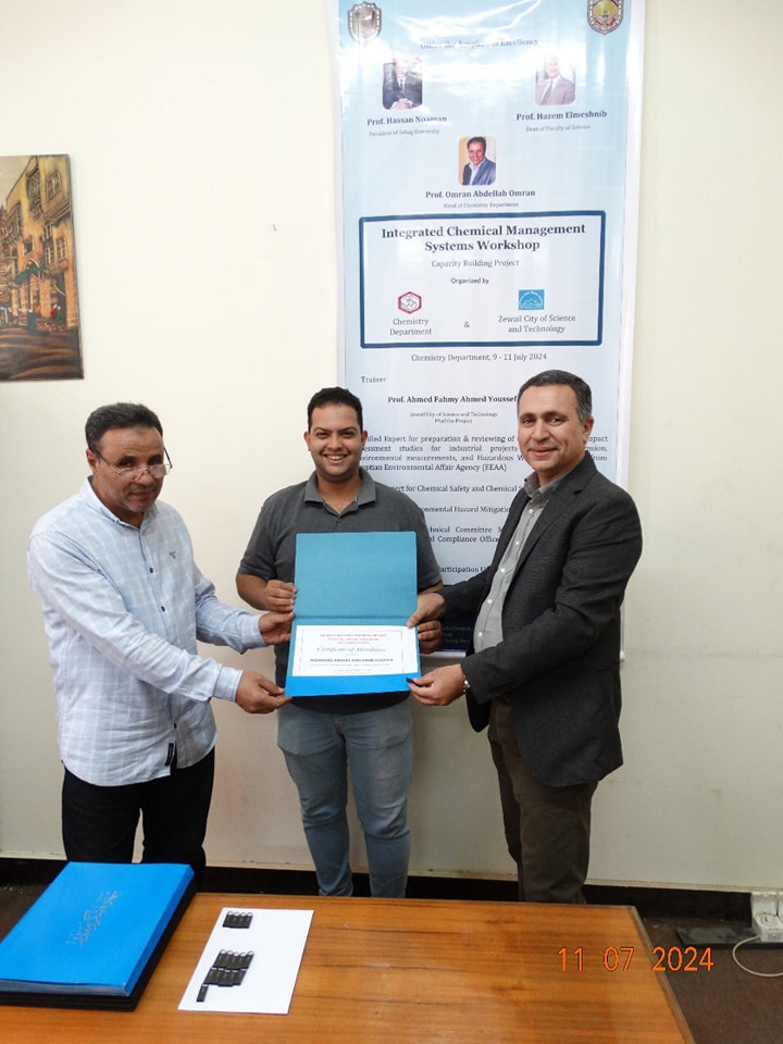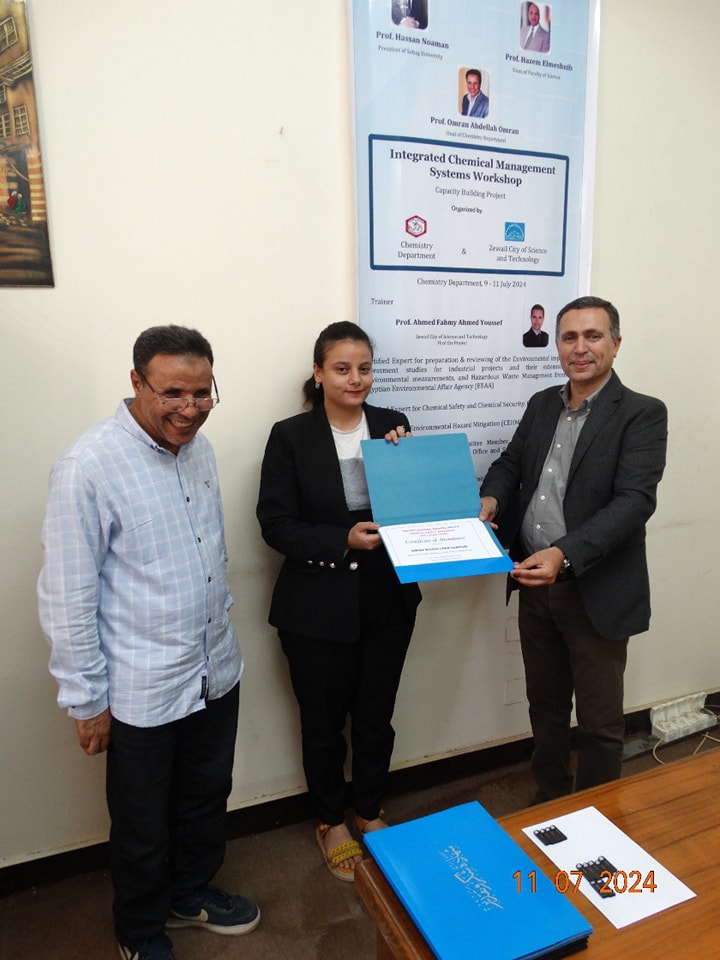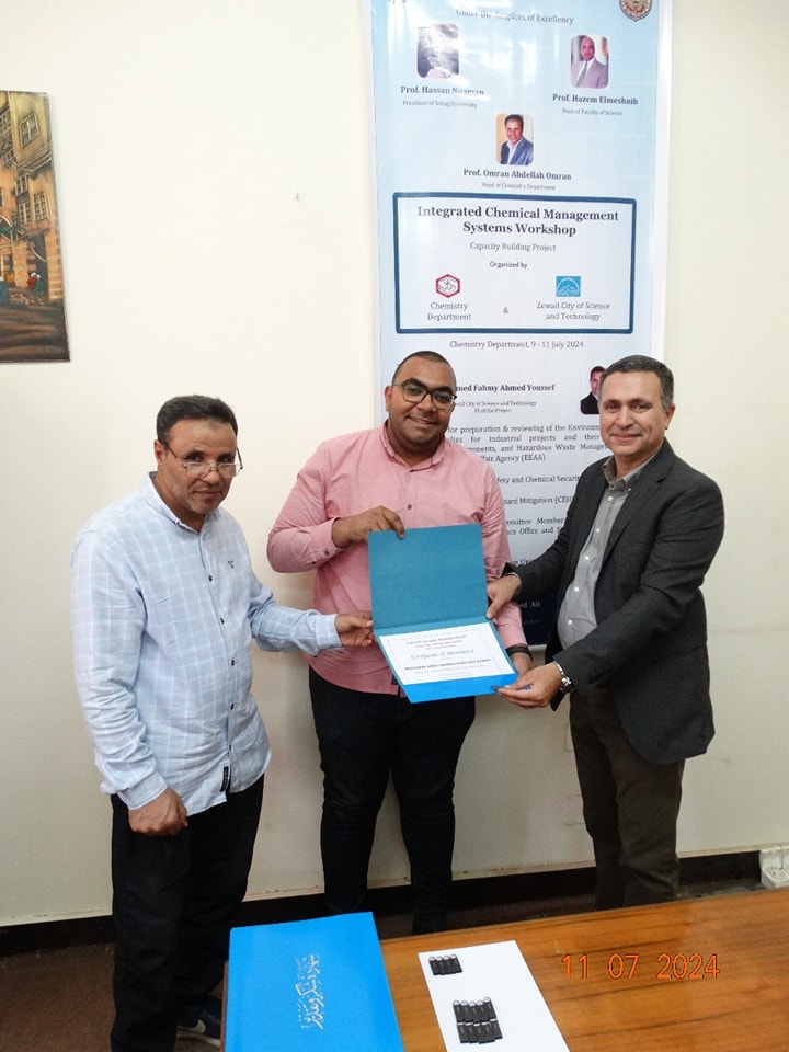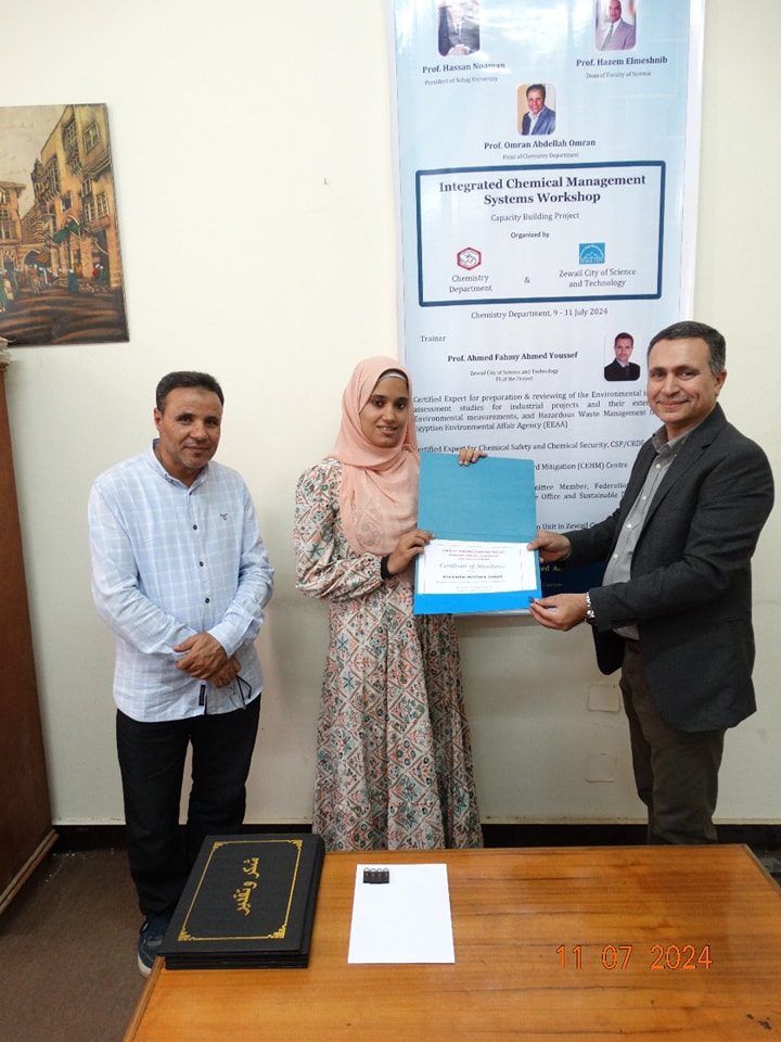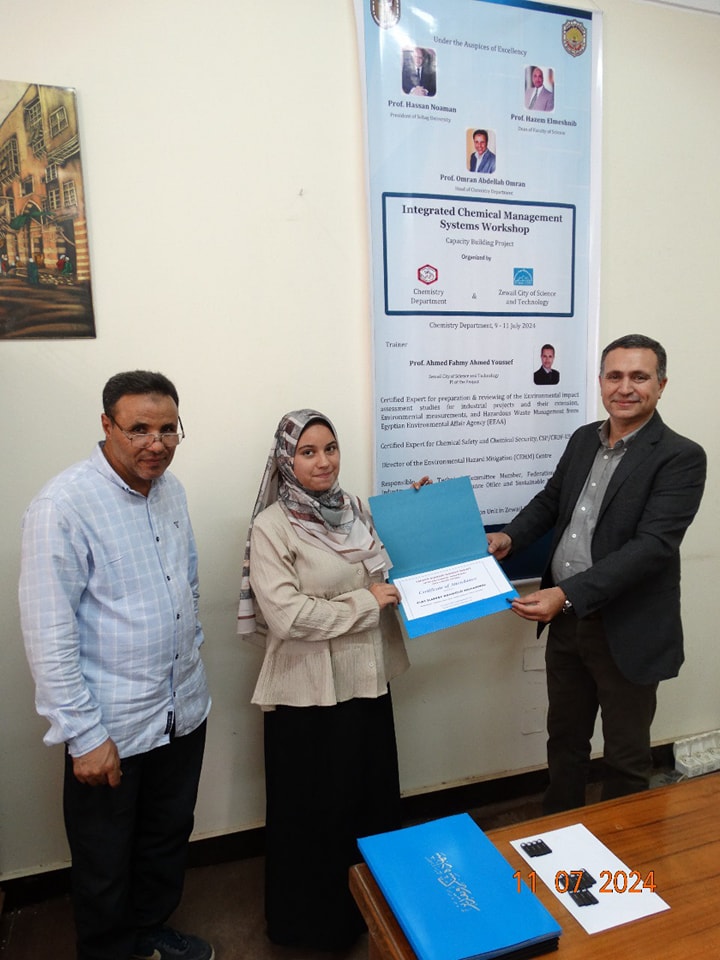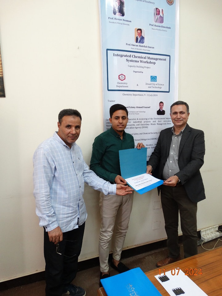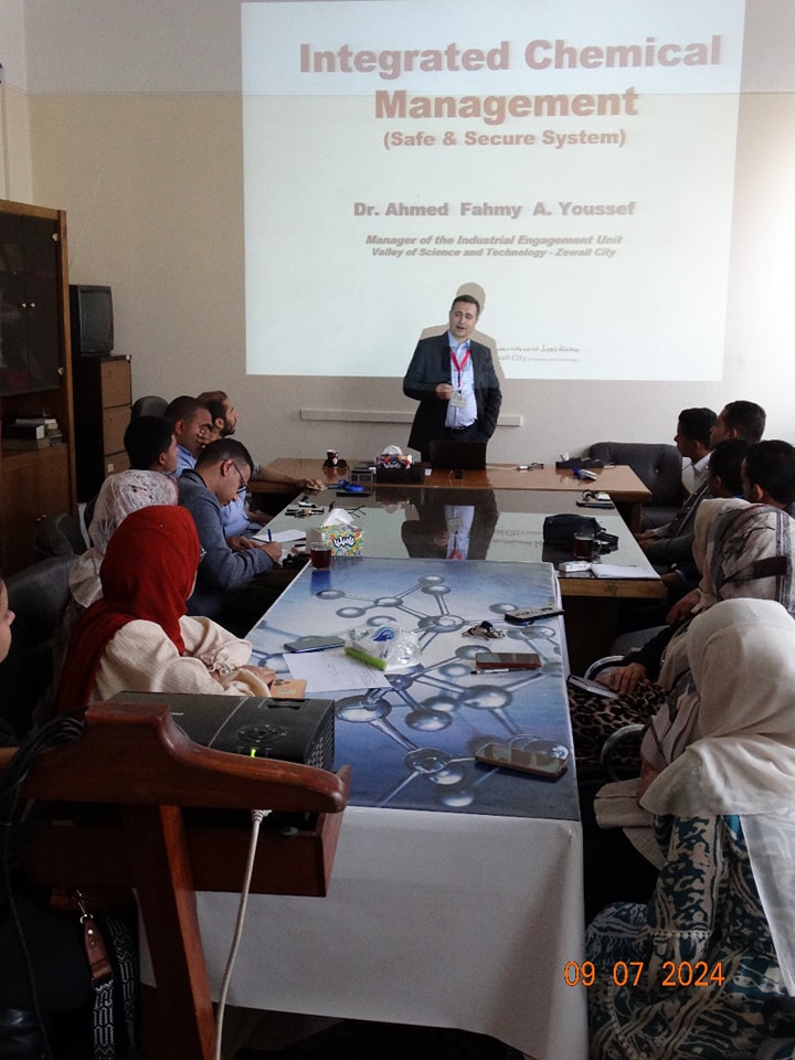تحت رعاية معالى الوزير الاستاذ الدكتور حسان النعمانى رئيس الوزراء وسعادة الأستاذ الدكتور حازم المشنب عميد كلية العلوم وبإشراف الاستاذ الدكتور عمران عبد اللاه رئيس قسم الكيمياء والاستاذ الدكتور طارق طه الاستاذ بقسم الكيمياء أقام قسم الكيمياء بالاشتراك مع مدينة زويل للعلوم والتكنولوجيا ورشة تدريبية بعنوان ” الإدارة المتكاملة للتعامل مع المواد الكيميائية الخطرة” فى الفتره من يوم الثلاثاء ٩ يوليو إلى الخميس ١١ يوليو ٢٠٢٤ والتى تستهدف اعضاء الهيئة المعاونة وأعضاء هيئة التدريس بقسم الكيمياء والتى حاضر فيها ا.د. احمد فهمى احمد يوسف مدير وحدة المشاركة الصناعية بوادى العلوم والتكنولوجيا بمدينة زويل واستشارى معتمد فى مجال الإدارة المتكاملة للمواد الكيميائية من الولايات المتحدة الأمريكية استاذ الكيمياء التحليلية بجامعة القاهرة دارت الورشه حول كيفية التعامل مع المواد الكيميائية خصوصا الخطره منها والتخلص الأمن وكيفية تخزين المواد الكيميائية والتعامل الآمن معها. وأشار سعادة الأستاذ الدكتور حازم المشنب أن كلية العلوم تهتم اهتماما كبيرا بالأمن والسلامه سواء للأفراد أو المنشأة وان كلية العلوم تنظم العديد من ورش العمل وتقوم بالتدريب الدورى لجميع منسوبى الكلية على الامن والسلامه والتخلص الأمن من المخلفات الكيميائية والبيولوجية وكيفية التعامل الصحيح مع المواد الكيميائية والبيولوجية.