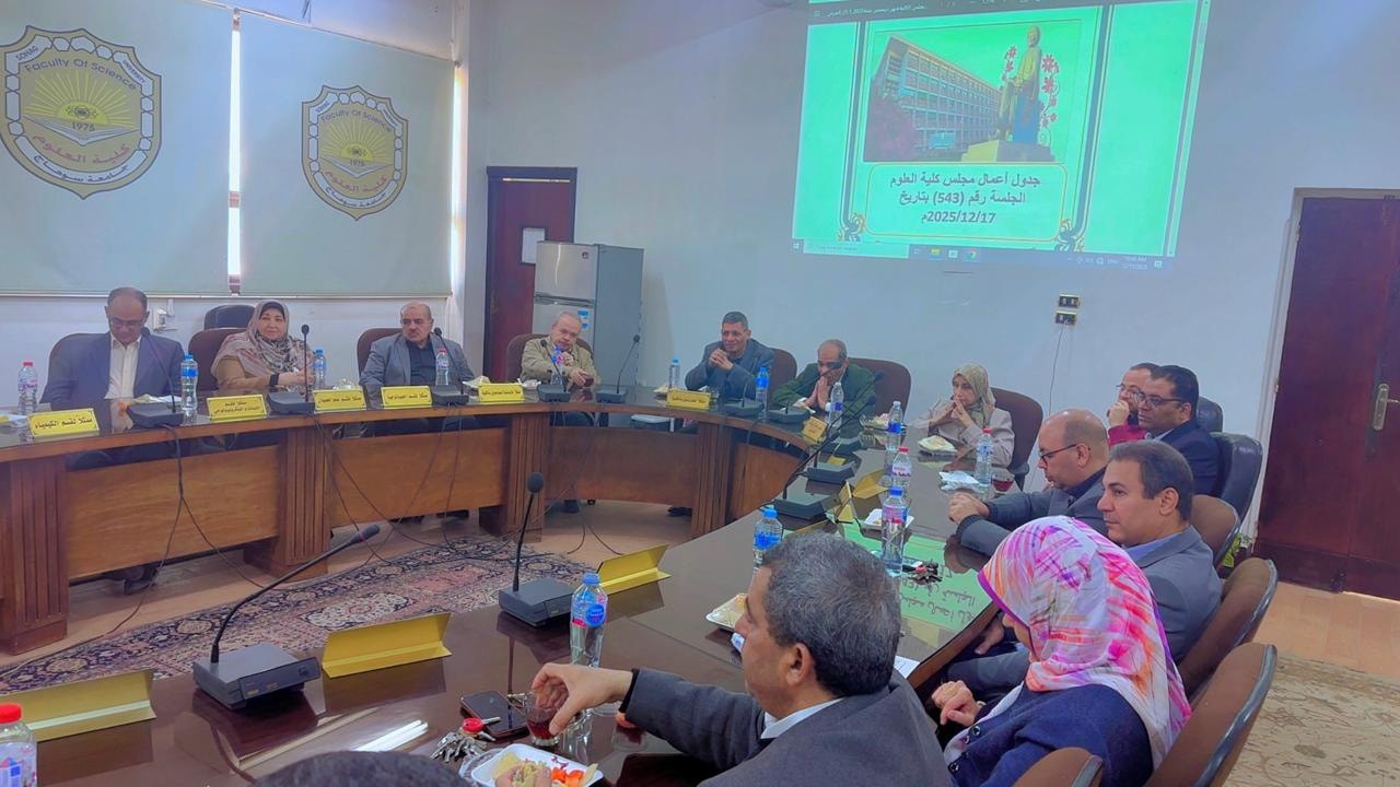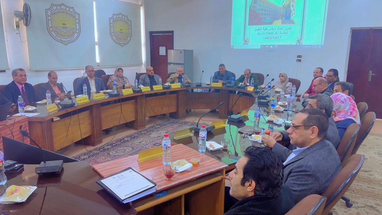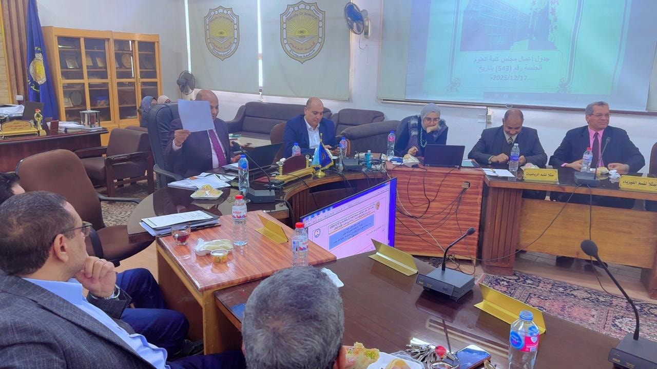 عقد مجلس كلية العلوم بجلسته رقم (543) اليوم الأربعاء الموافق 17 ديسمبر 2025م، في تمام الساعة الحادية عشرة صباحاً ، بقاعة مجلس الكلية، برئاسة سعادة الأستاذ الدكتور/ حازم محمود علي درويش عميد الكلية ورئيس المجلس، وبحضور السادة أعضاء المجلس.