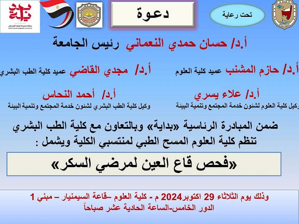 نشر على 28 أكتوبر, 2024نشر في احداث وفعاليات،اخبار الكلية “مسح طبي لمنتسبي كلية العلوم” ضمن المبادرة الرئاسية “بداية” تصفّح المقالات ندوة علمية هامة بعنوان: “البيولوجيا الجزيئية الخلوية من الإكتشاف إلي التطبيق “دورة تدريبية عن كيفية إعداد المعايير الأكاديمية