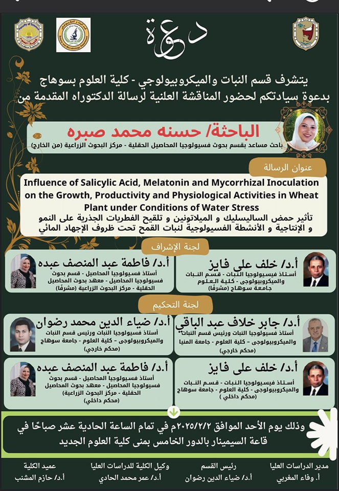 “تأثير حمض الساليسيليك والميلاتونين وتلقيح الفطريات الجذرية على النمو والإنتاجية والأنشطة الفسيولوجية لنبات القمح تحت ظروف الإجهاد المائي.”