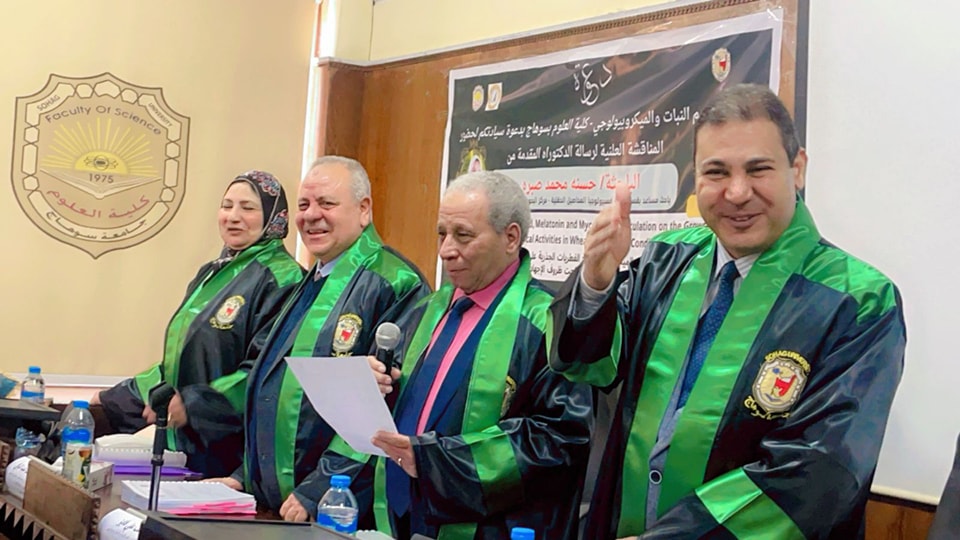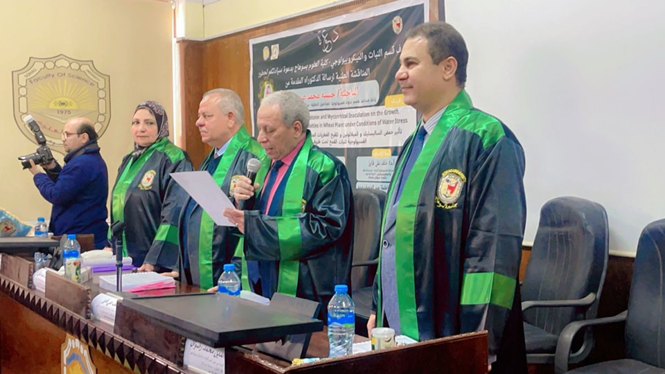 تحت رعاية معالي العميد الأستاذ الدكتور حازم المشنب، وسعاده الاستاذ الدكتور عمر محمد الحادى وكيل الكلية لشئون الدراسات العلياوالبحوث وسعادة الاستاذ الدكتور ضياء الدين رضوان رئيس قسم النبات و الميكروبيولوجى نوقشت اليوم رسالة الدكتوراه للطالبة حسنة محمد صبره الباحث المساعد بالمركز القومي للبحوث الزراعية، بعنوان:
