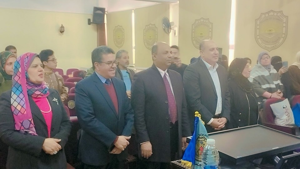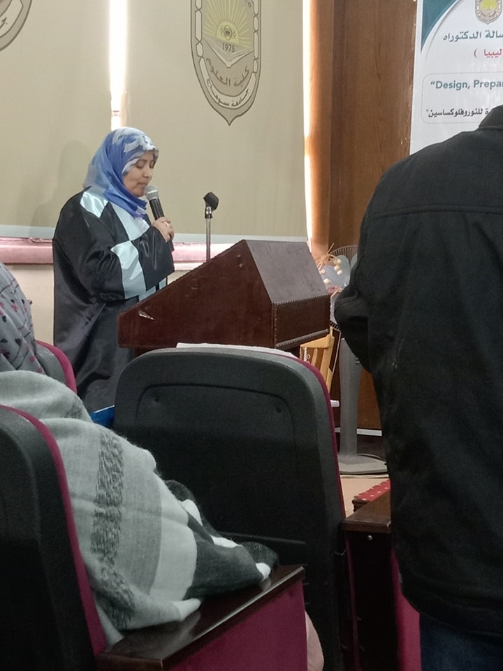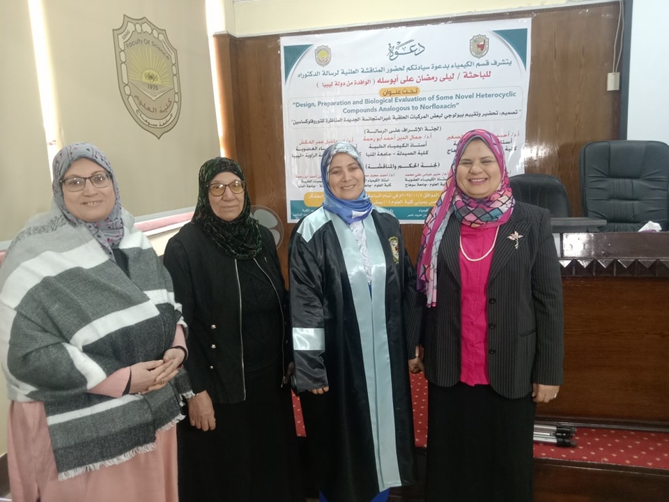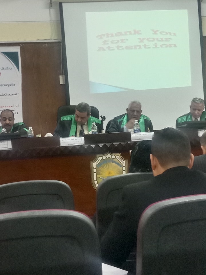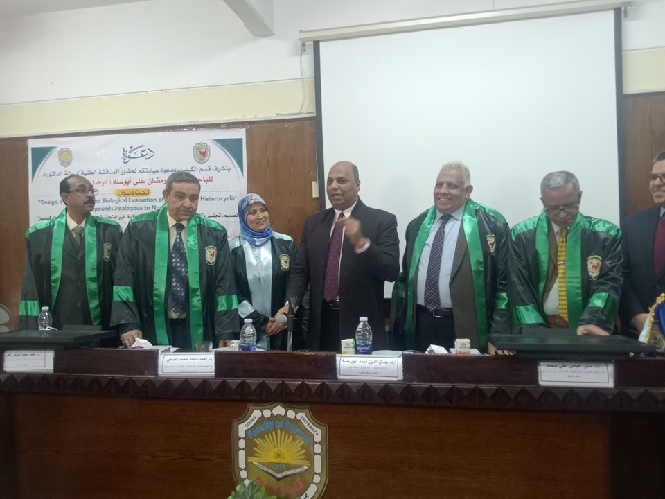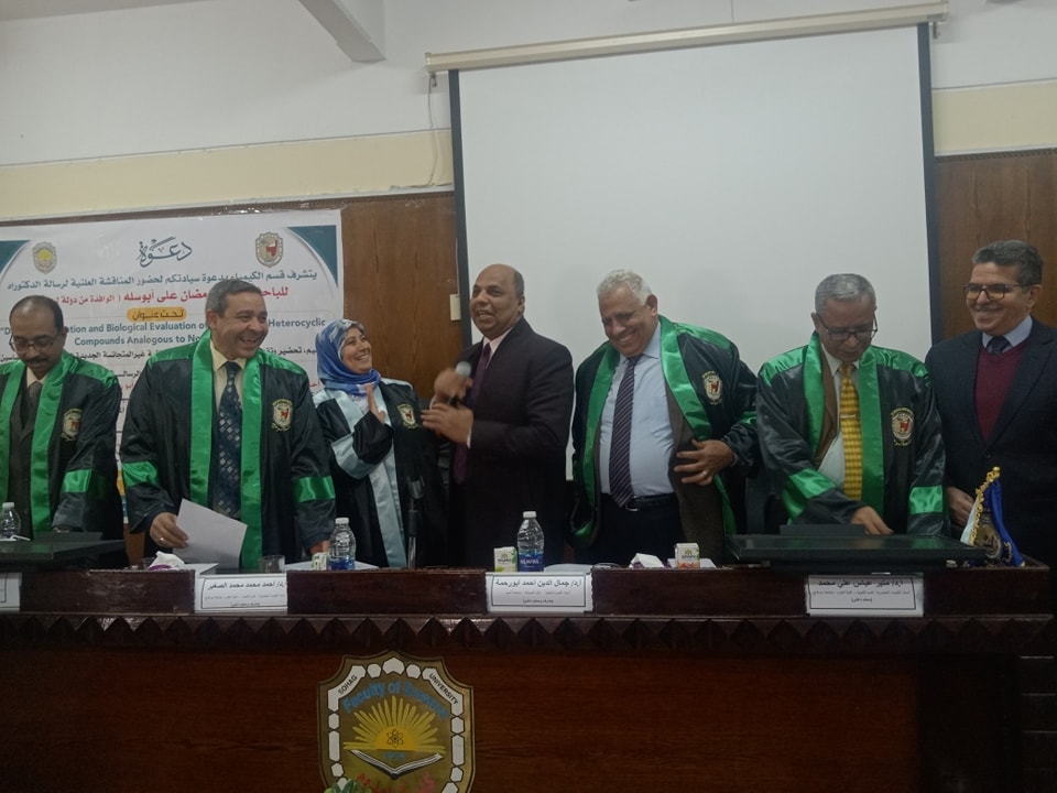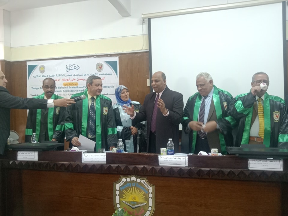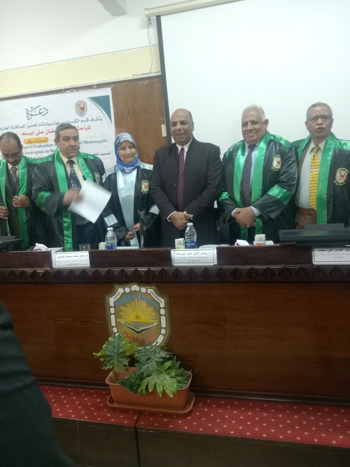 وذلك تحت رعاية معالي الوزير الاستاذ الدكتور حسان النعمانى رئيس الجامعه وسعادة أ.د / حازم محمود المشنب عميد الكلية وبحضور السادة الوكلاء أ.د / حسين عبد الحافظ الزناتي وكيل الكلية لشئون التعليم والطلاب و أ .د علاء يسرى وكيل الكلية لشئون خدمة المجتمع وتنمية البيئة وأ .د عمر محمد الحادى وكيل الكلية لشؤون الدراسات العليا والبحوث و أ.د / لبنى عبد المحسن عبيد رئيس قسم الكيمياء و د ياسر رفعت مدير إدارة الدراسات العليا المركزيه و الأستاذة وفاء المغربي مديرة إدارة الدراسات العليا ولفيف من أعضاء هيئة التدريس و معاونيهم و أسرة الباحثه. وتكونت لجنة الإشراف من الاستاذ الدكتور أحمد محمد الصغير استاذ الكيمياء العضوية جامعة سوهاج والاستاذ الدكتور جمال ابو رحمه كلية الصيدلة جامعة المنيا والاستاذ الدكتور اسماعيل عمر العكش من جامعة الزاويا بليبيا وتكونت لجنة المناقشة والحكم من الاستاذ الدكتور أحمد الاستاذ الدكتور أحمد محمد الصغير استاذ الكيمياء العضوية والاستاذ الدكتور أحمد بكر استاذ الكيمياء العضويه جامعة جنوب الوادي والاستاذ الدكتور منير عباس على استاذ الكيمياء العضوية جامعة سوهاج و الاستاذ الدكتور جمال ابو رحمه كلية الصيدلة جامعة المنيا