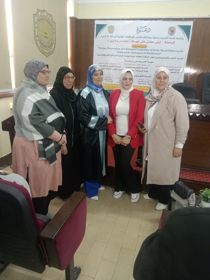 نوقشت اليوم الأحد ٥ يناير ٢٠٢٥ رسالة الدكتوراه للطالبة ليلى رمضان على ابو سلة من دولة ليبيا الشقيقة بعنوان **تصميم وتحضير وتقييم بيولوجي لبعض المركبات الخلقيه غير المتجانسة الجديدة المناظرة لنورفلوكساسين**