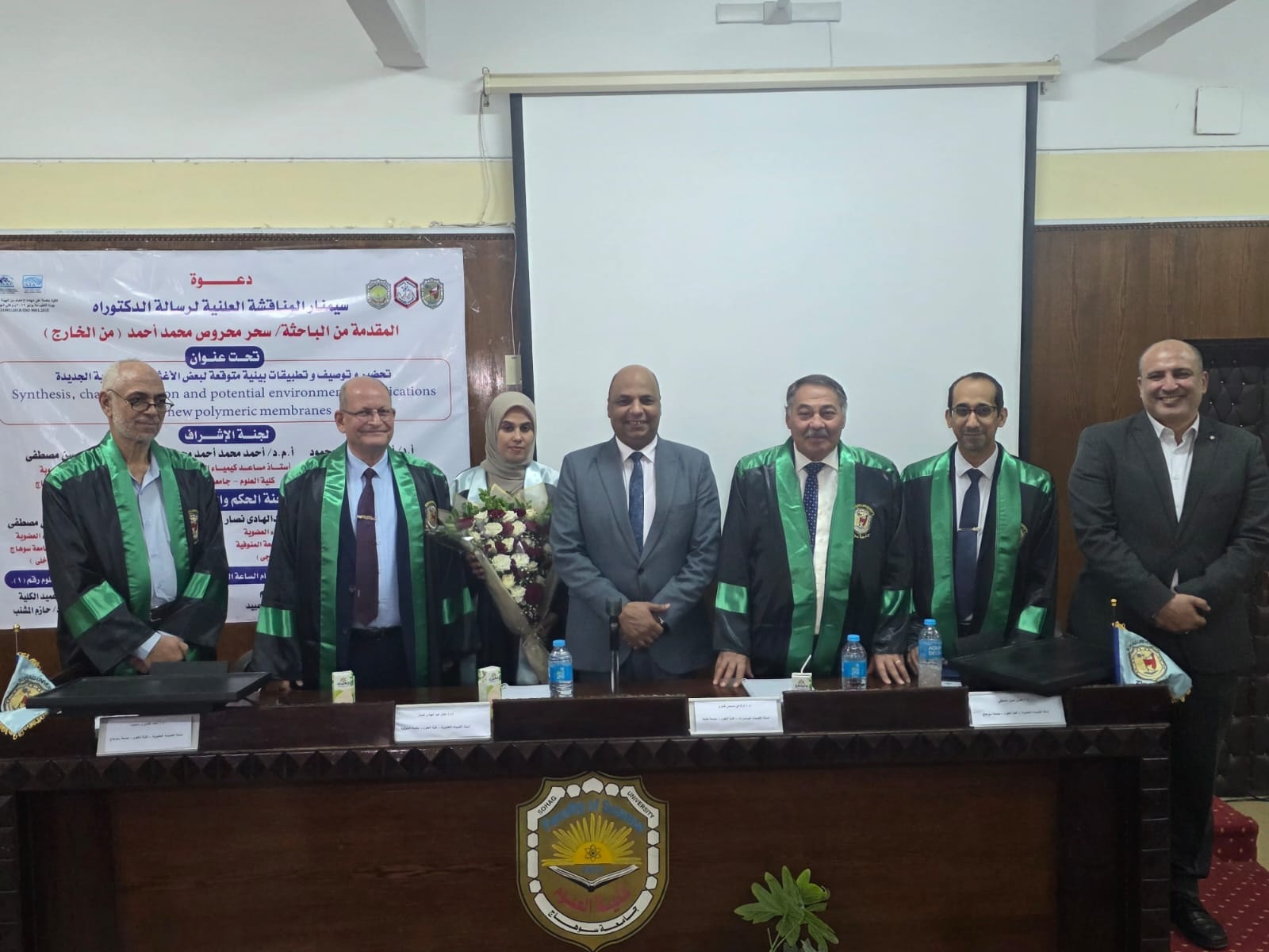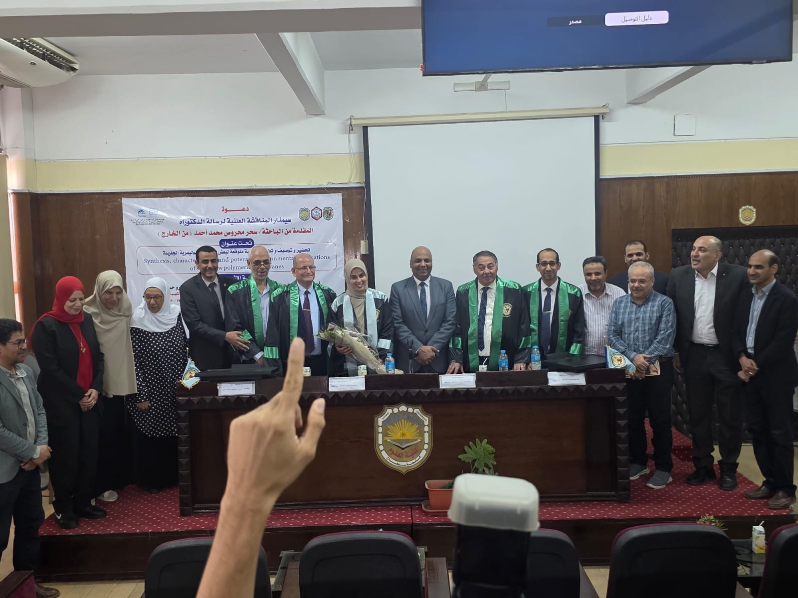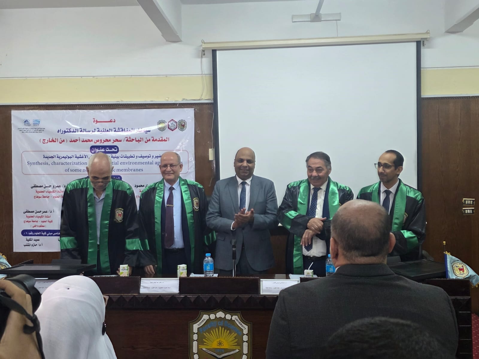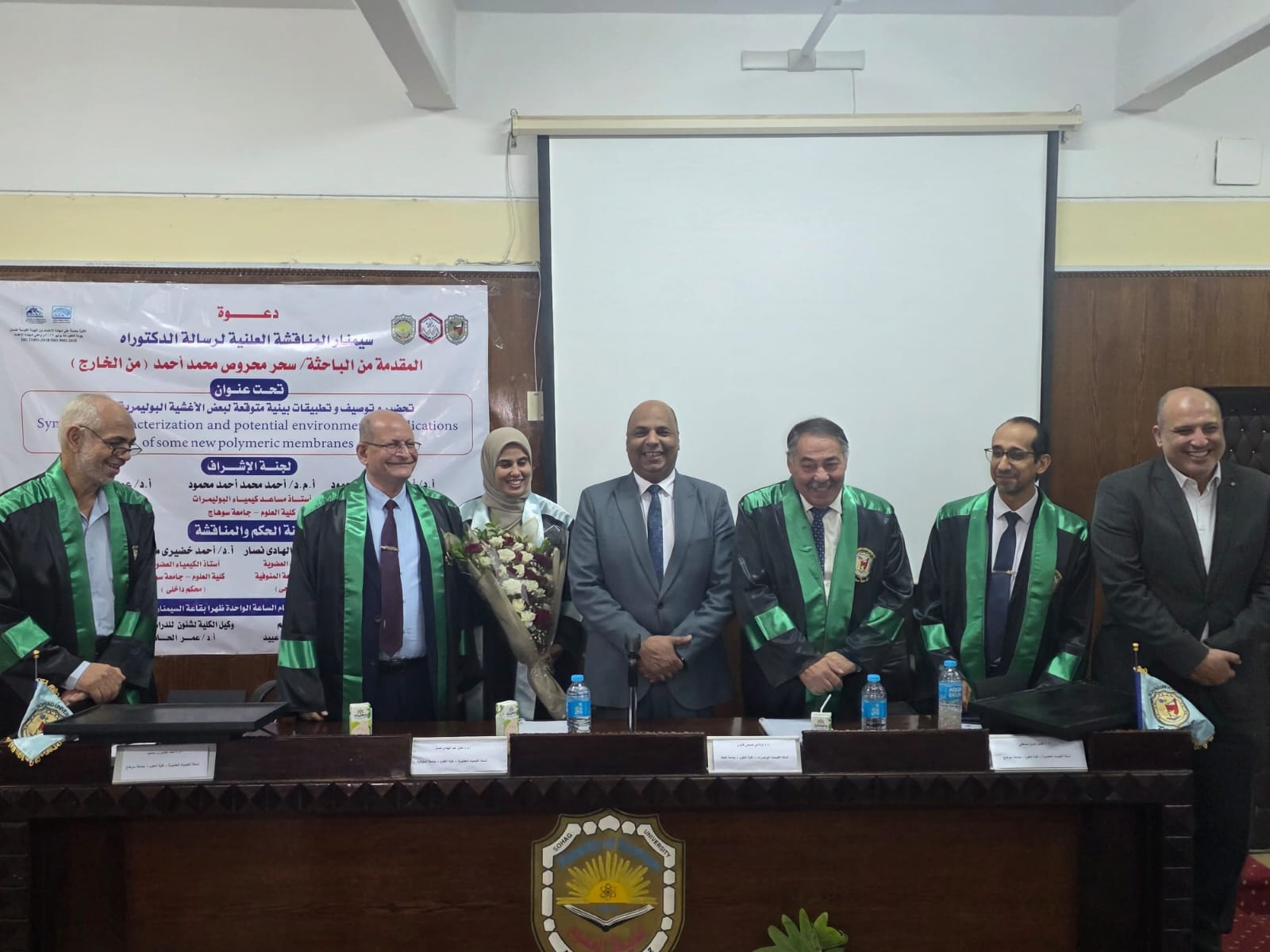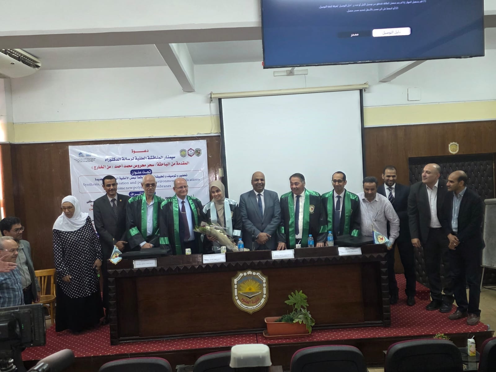 تحت رعاية سعادة الأستاذ الدكتور حازم المشنب عميد كلية العلوم بسوهاج وريادة سعادة الأستاذ الدكتور عمر محمد الحادى وكيل الكلية لشؤون الدراسات العليا والبحوث و الأستاذ الدكتوره لبني عبد المحسن عبيد رئيس قسم الكيمياء شهدت كلية العلوم جامعة سوهاج اليوم مناقشة رسالة الدكتوراه للباحثة سحر محروص محمد أحمد تحت عنوان تحضير وتوصيف وتطبيقات بيئية متوقعة لبعض الأغشية البوليمرية الجديدة وقد أشرف على الرسالة كل من الأستاذ الدكتور أحمد خضيرى محمود والأستاذ الدكتور عمرو حسن مصطفى والأستاذ الدكتور أحمد محمد أحمد محمود فيما تكونت لجنة الحكم والمناقشة من الأستاذ الدكتور الرفاعي صبحى قناوى استاذ كيمياء البوليمرات بكلية العلوم جامعة طنطا والأستاذ الدكتور عادل عبد الهادي نصار استاذ الكيمياء العضوية بكلية العلوم جامعة المنوفية والأستاذ الدكتور أحمد خضيرى محمود استاذ الكيمياء العضوية بكلية العلوم جامعة سوهاج والأستاذ الدكتور عمرو حسن مصطفى استاذ الكيمياء العضوية بكلية العلوم جامعة سوهاج. تناولت الرسالة تحضير وتوصيف أغشية بوليمرية جديدة ذات تطبيقات بيئية واعدة
