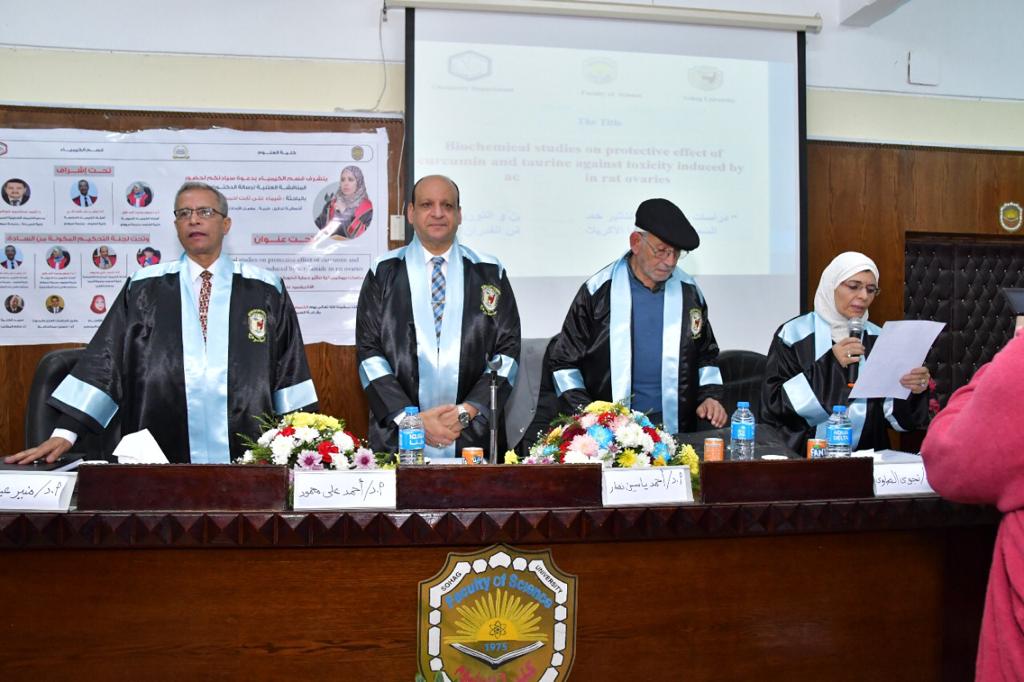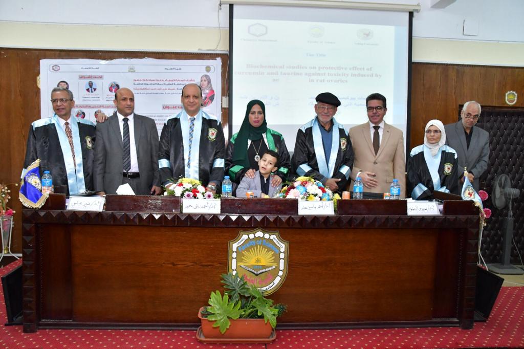 وذلك تحت رعاية عميد الكلية أ.د / حازم محمود المشنب و في حضور سعادة وكيل الكلية لشؤون الدراسات العليا أ.د / حسين عبد الحافظ الزناتي وسعادة رئيس مجلس القسم أ.د / لبنى عبد المحسن عبيد ولفيف من أعضاء هيئة التدريس و معاونيهم و أسرة الباحث.