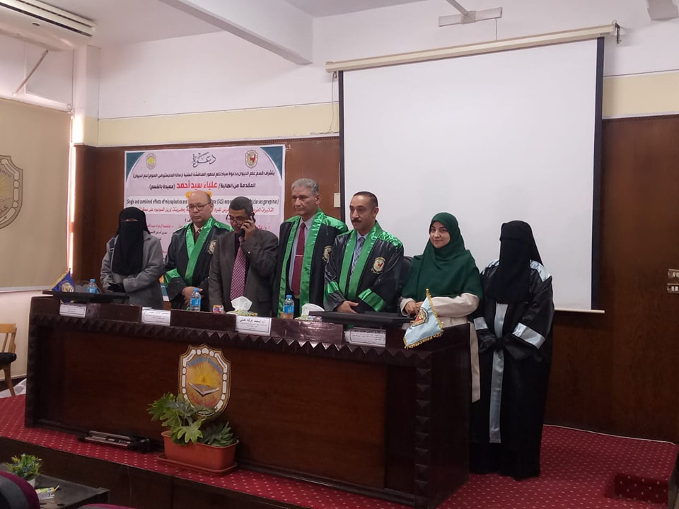 تحت رعاية معالي الأستاذ الدكتور حازم المشنب عميد كلية العلوم، وسعادة الأستاذ الدكتور عمر محمد الحادي وكيل الكلية لشؤون الدراسات العليا والبحوث، وسعادة الأستاذ الدكتور حمدي أحمد محمد سليمان رئيس قسم علم الحيوان، تمت اليوم المناقشة العلنية لرسالة الماجستير المقدمة من الطالبة علياء سيد أحمد (معيدة بقسم علم الحيوان) بعنوان: