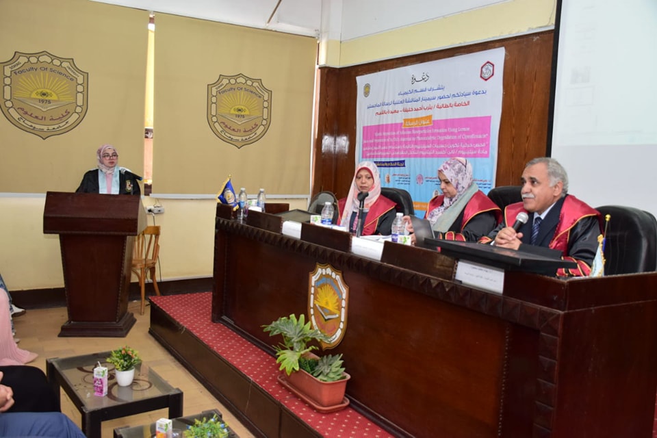 تحت رعاية سعادة الأستاذ الدكتور حازم محمود المشنب عميد كلية العلوم والاستاذ الدكتور عمرمحمد الحادى وكيل الكلية لشئون الدراسات العليا والبحوث تم مناقشة رسالة الماجستير في الكيمياء اللاعضوية للطالبة يثرب احمد خليفة المعيدة بقسم الكيمياء بعنوان:
