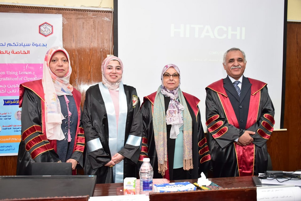 و قد أوضح ا د حازم المشنب ان الرسالة ذات جوانب تطبيقية متعددة و تتوافق من اهداف التنمية المستدامة كما أشار ا د عمر الحادى ان الرسالة تتوافق مع متطلبات الكيمياء الخضراء من حيث طرق التحضير التي استخدامها للحصول على المواد التي تم دراستها أيضا وضحت ا د لبنى عبد المحسن ان الدراسة قد تضمنت معالجة المياه الملوثة بالمضادات الحيوية باستخدام تقنية النانو الخضراء، حيث تم استخدام عصير الليمون كمادة مختزلة صديقة للبيئة لتحضير جسيمات السيلينيوم النانوية ودمجها مع ثاني أكسيد التيتانيوم، لتحضير عامل حفازضوئيا لتكسير الملوثات البيولوجية في المياه بما يحقق كفاءة عالية في التخلص من الملوثات الدوائية بطرق اقتصادية.