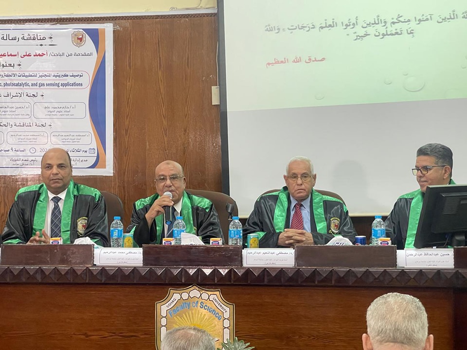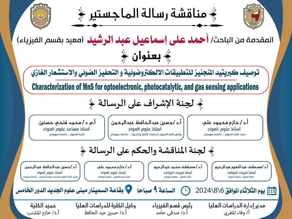تم اليوم مناقشة رسالة الماجستير المقدمة من الطالب / احمد على اسماعيل المعيد بقسم الفيزياء بعنوان ** توصيف كبرتيد المنجنيز للتطبيقات الالكتروضوئية والتحفيز الضوئى والاستشعار الغازى** تحت إشراف الأستاذ الدكتور حازم المشنب عميد كلية العلوم والاستاذ الدكتور حسين عبد الحافظ وكيل الكلية لشئون الدراسات العليا البحوث والدكتور محمد فتحى الاستاذ المساعد بقسم الفيزياء. وتكونت لجنة المناقشة والحكم من الاستاذ الدكتور مصطفى عبد النعيم استاذ فيزياء الجوامد جامعة أسيوط والاستاذ الدكتور مصطفى محمد استاذ فيزياء الجوامد جامعة سوهاج والأستاذ الدكتور حازم المشنب عميد الكلية وأستاذ علوم المواد والاستاذ الدكتور حسين عبد الحافظ وكيل الكلية للدراسات العليا والبحوث وأستاذ علوم المواد بجامعة سوهاج.