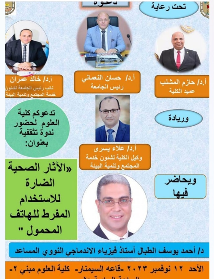تحت رعاية معالى الوزير أ. د. حسان النعمانى رئيس جامعة سوهاج، أ. د. خالد عمران نائب رئيس الجامعة لشئون خدمة المجتمع وتنمية البيئة والاستاذ الدكتور حازم المشنب عميد كلية العلوم وريادة الاستاذ الدكتور علاء يسرى وكيل الكلية لشئون خدمة المجتمع وتنمية البيئة وفى إطار سلسلة الندوات المجتمعيه والبيئية التى تنظمها كلية العلوم أقامت الكليه اليوم ١٢ نوفمبر ٢٠٢٣ ندوة تثقيفية بعنوان الاثار الصحية الضاره للاستخدام المفرط للهاتف للمحمول والتى حاضر فيها سعادة الأستاذ الدكتور أحمد يوسف الطبال الاستاذ بقسم الفيزياء والتى أوضح فيها الأضرار على الصحه من الاستخدام المفرط للهاتف المحمول مثل الشعور المستمر بالصداع. الإضرار بصحة القلب والأوعية الدموية، حيث إن الإشعاعات المنبعثة من الهاتف تؤثرعلى كرات الدم الحمراء الحاملة للهيموجلوبين وبالتالي تزيد من خطر الإصابة بأمراض القلب. وكذلك التسبب بحدوث اضطربات بالجهاز العصبي، كالتأثير على حاسة التذوق.