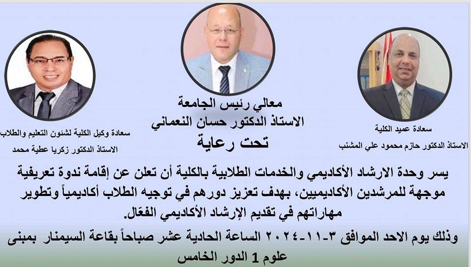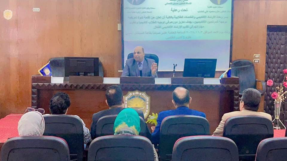 تحت رعاية معالي الوزير الأستاذ الدكتور حسان النعماني رئيس الجامعه، وسعاده الاستاذ الدكتور عبد الناصر يس نائب رئيس الجامعة لشؤون التعليم والطلاب وسعادة الأستاذ الدكتور حازم المشنب، عميد كلية العلوم، وسعادة لأستاذ الدكتور زكريا عطية، وكيل الكلية لشؤون التعليم والطلاب، نظمت وحدة الإرشاد الأكاديمي والخدمات الطلابية بالكلية ندوة تعريفية حول الإرشاد الأكاديمي، ألقاها الأستاذ الدكتور حازم المشنب، بحضور وكلاء الكلية ومدير وحدة الإرشاد الأكاديمي والخدمات الطلابية ونواب وحدة الارشاد الاكاديمي ومدير وحدة الجودة.
