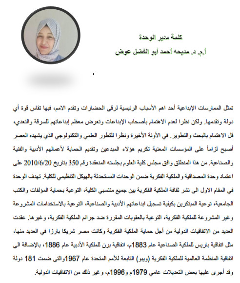 وافق مجلس الكلية بجلسته رقم 350 المنعقدة بتاريخ 20/6/2010 على اعتماد وحدة الملكية الفكرية ضمن الوحدات المستحدثة بالهيكل التنظيمي للكلية.