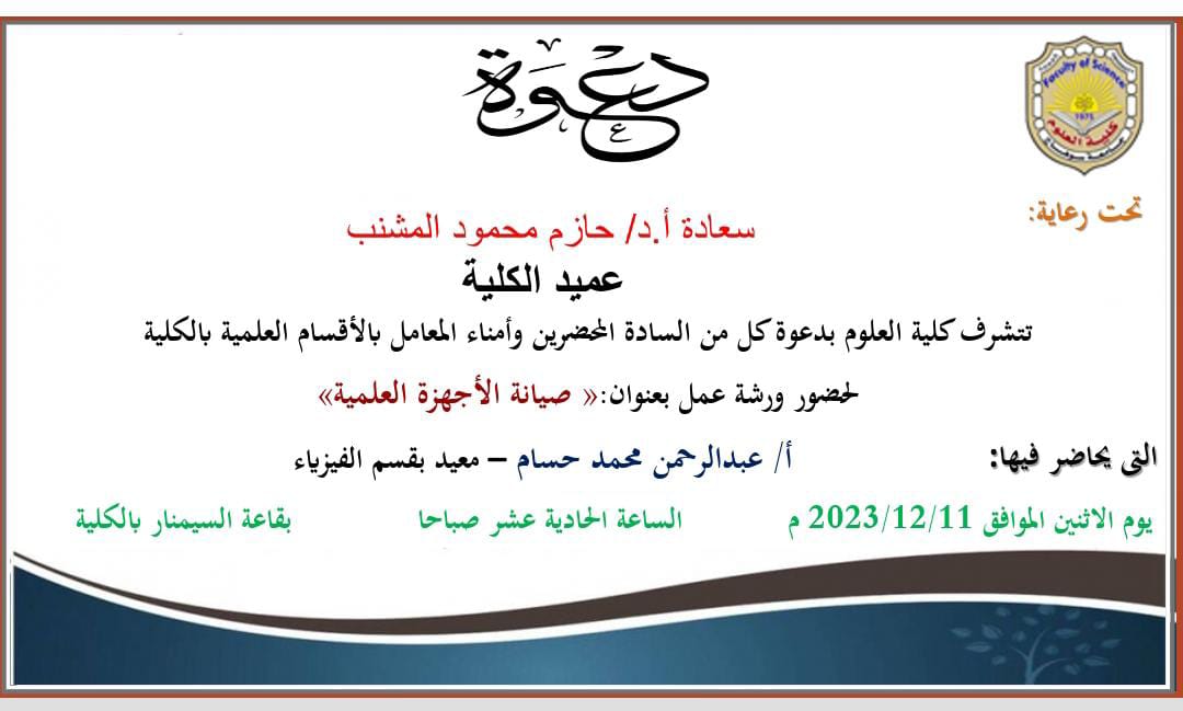 نشر على 10 ديسمبر, 2023نشر في احداث وفعاليات،اخبار الكلية،اخبار قسم الفيزياء ورشة عمل بعنوان “صيانة الاجهزة العلمية” تصفّح المقالات اجتماع عميد الكليه و رؤساء الاقسام استعدادا للامتحانات.النعماني يتقدم مسيرة ضخمة وحاشدة إلى صناديق إقتراع الانتخابات الرئاسية ٢٠٢٤