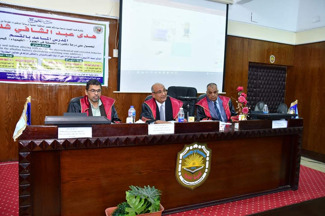 وذلك في حضور سعادة السادة وكلاء الكلية الافاضل وكيل الكلية لشؤون الدراسات العليا أ.د / حسين عبد الحافظ ووكيل الكلية لشؤن البيئة و المجتمع أ.د/ علاء يسرى وسعادة رئيس مجلس القسم أ.د / لبنى عبد المحسن عبيد ولفيف من أعضاء هيئة التدريس و معاونيهم و أسرة الباحث.
