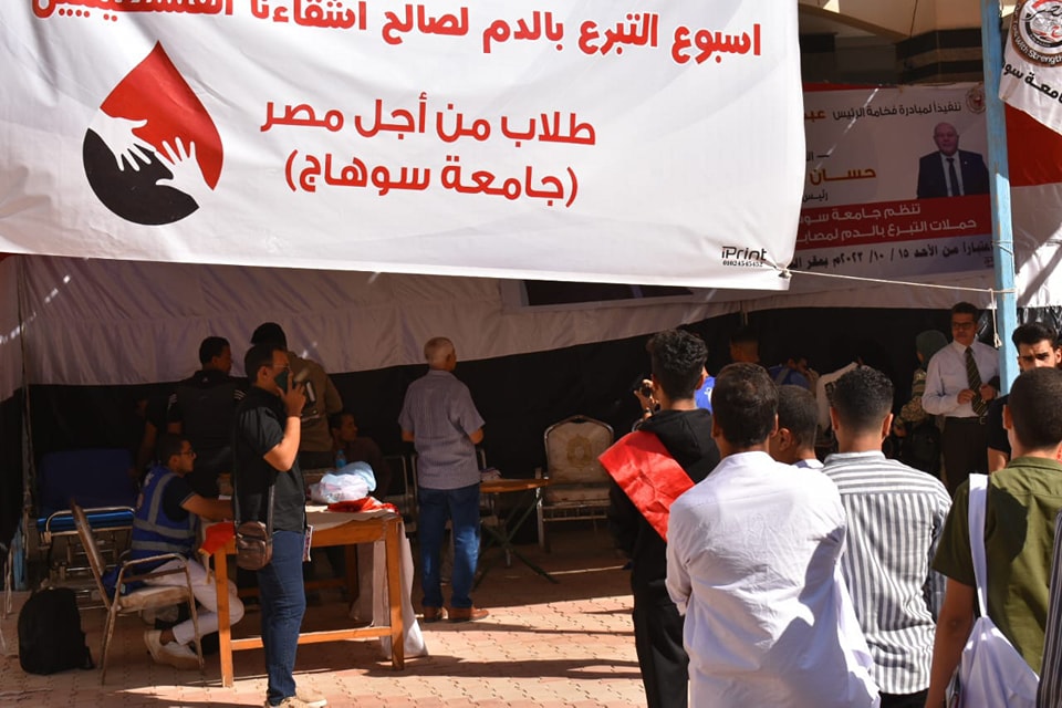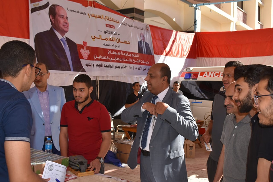 تحت رعاية معالى الوزير حسان النعمانى رئيس الجامعه نظمت جامعة سوهاج حملة تبرع بالدم للأشقاء الفلسطينيين شاركت فيها كليات جامعة سوهاج، افاد بذلك سعادة الأستاذ الدكتور حازم المشنب عميد الكلية والذي انتقل بصحبة السادة الوكلاء الاستاذ الدكتور حسين عبدالحافظ وكيل الكلية للدراسات العليا والاستاذ الدكتور زكريا عطية وكيل الكلية لشؤون الطلاب والاستاذ الدكتور علاء يسري وكيل الكليه لخدمة المجتمع والسادة رؤساء الاقسام واعضاء هيئة التدريس والعاملين والطلاب للتبرع بالدم، لصالح المصابين الفلسطينين من ابناء غزة، وأشار الاستاذ الدكتور حازم المشنب أن حملة التبرع بالدم أطلقها فخامة الرئيس عبدالفتاح السيسي والذى وجّه بتقديم الدعم الفوري والإغاثة الإنسانية لدولة فلسطين الشقيقة والتى لاقت ترحابا كبيرا من جميع المصريين وهو ما يتم بشكل مستمر في إطار دعم وتضامن مصر مع الشعب الفلسطيني الشقيق