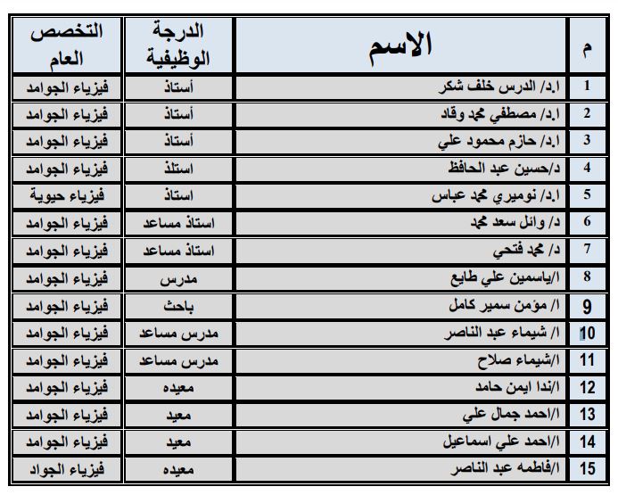 - أ.د/ الدرس خلف شكر عبدالله (أستاذ متفرغ) ……. فيزياء نووية تجريبية